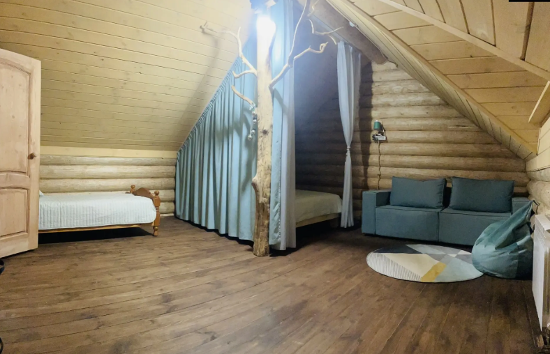 В студии, расположенной на втором этаже нового коттеджа, вас ждет большая удобная кровать, два дивана, а также обеденный уголок — все, что необходимо для комфортного пребывания как в одиночестве, так и в компании. При необходимости в студии возможно размещение дополнительного спального места.