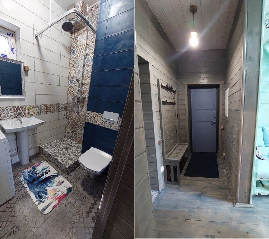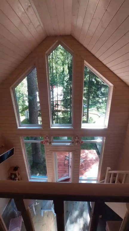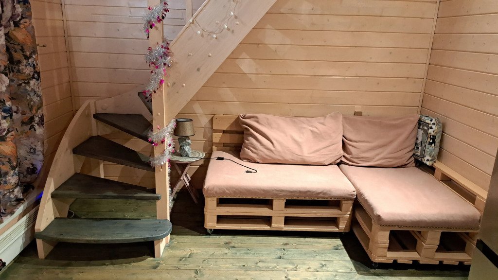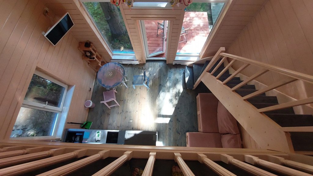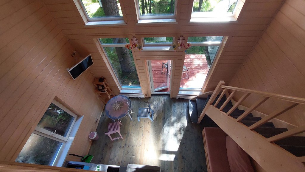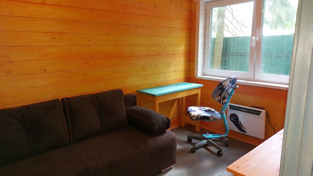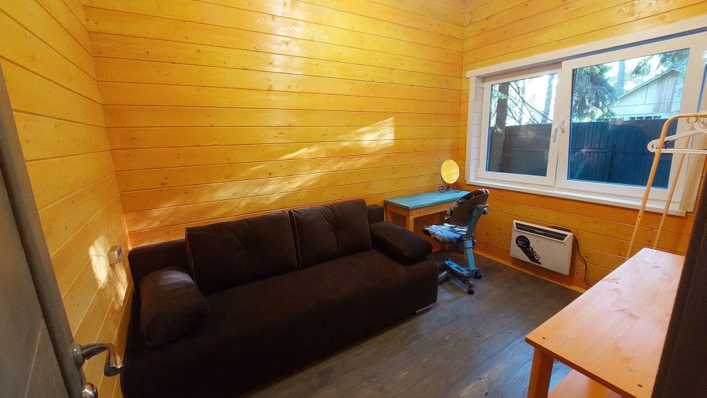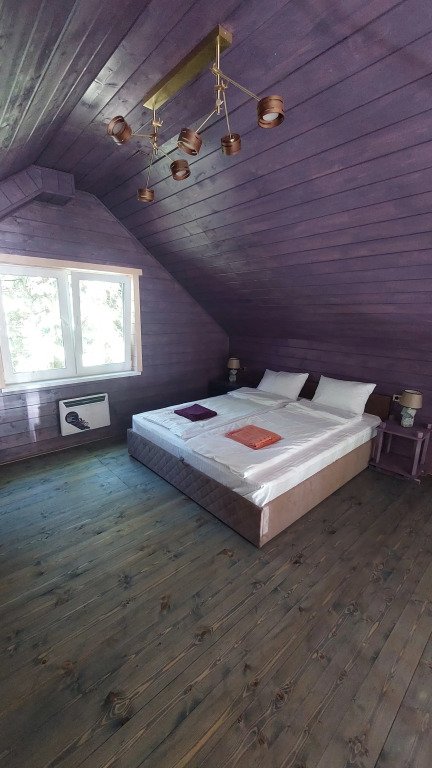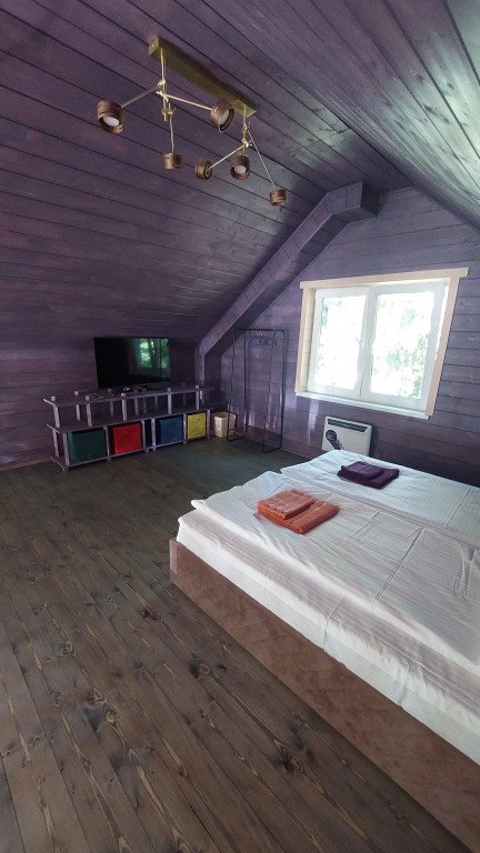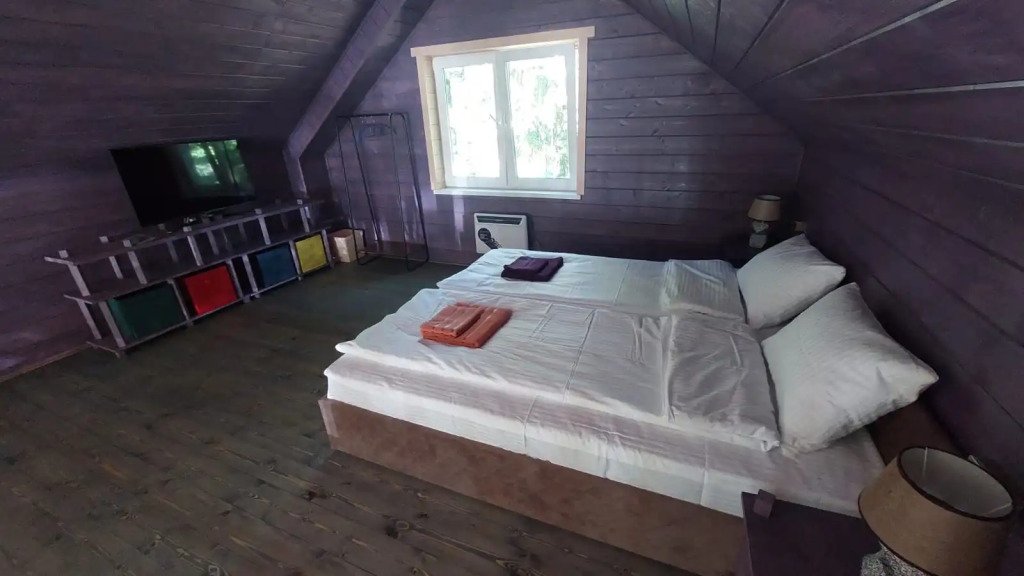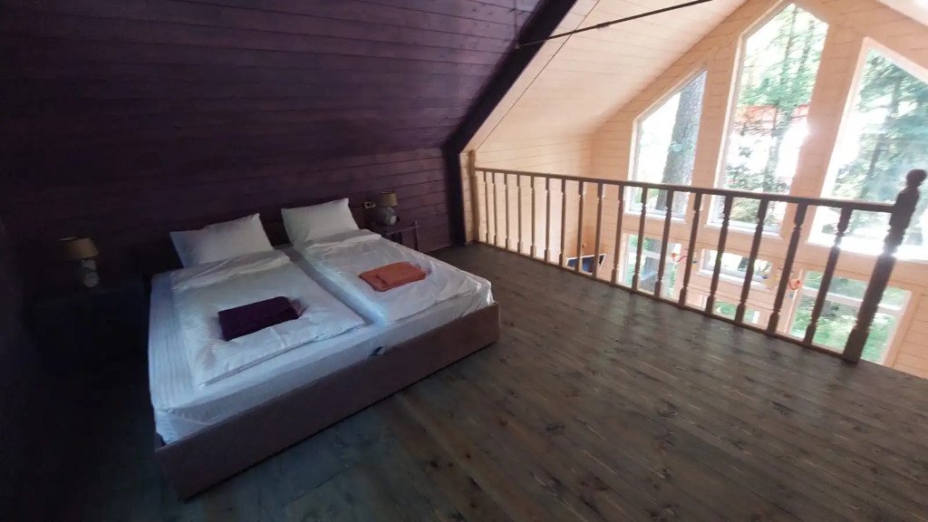 Домики двухэтажные, 55 кв. м, второй этаж — мансардный. Гостям предоставляются постельное бельё и разноцветные полотенца, по запросу детские кроватка и стульчик.