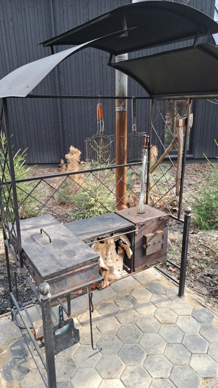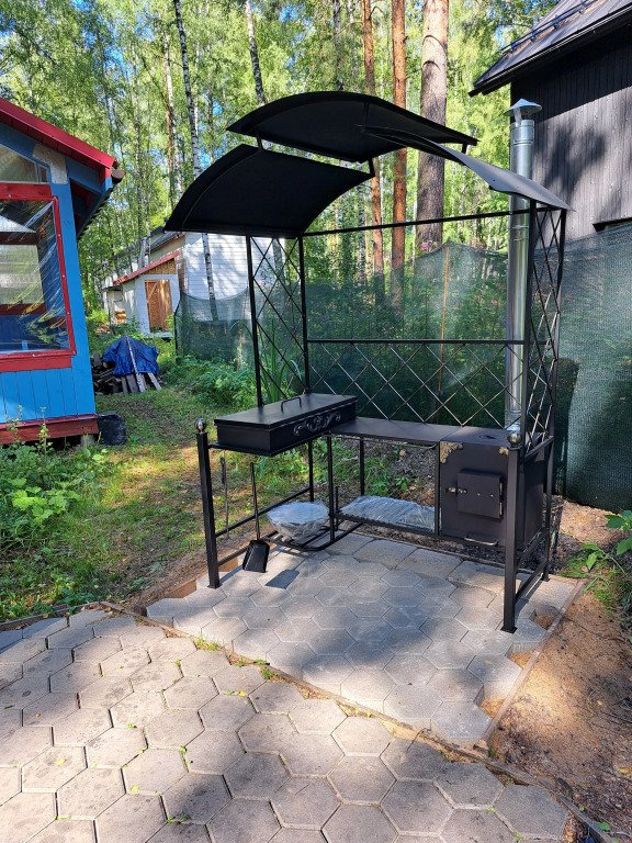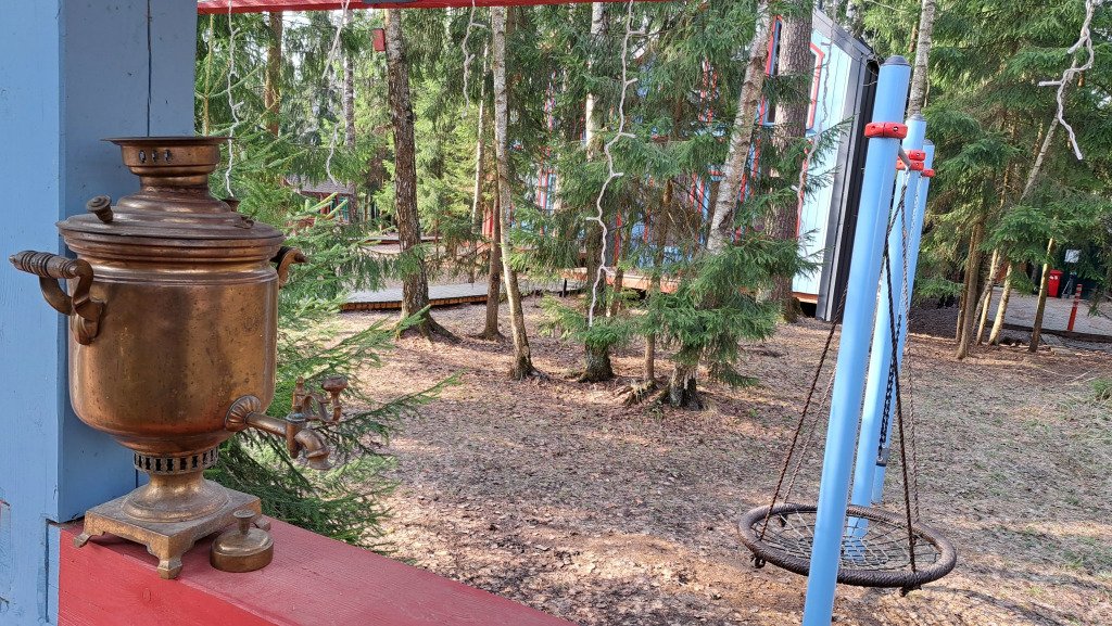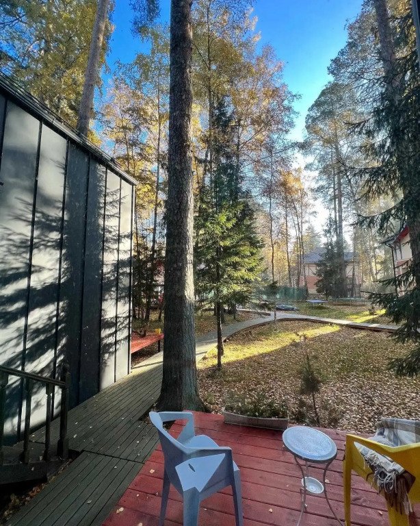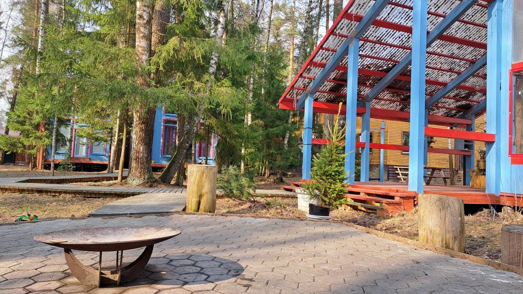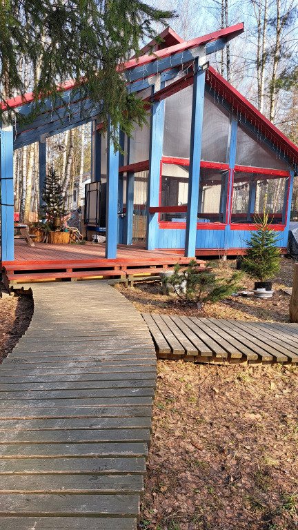 На участке в 20 соток: 3 дома (хозяйский и 2 гостевых домика), деревянные дорожки, есть уличная закрытая веранда-терраса и открытая веранда-терраса с камином и оборудованной летней кухней 50 кв. м, мангальная и костровая зоны, закрытая парковка для гостей, на участке вековые сосны и ели.