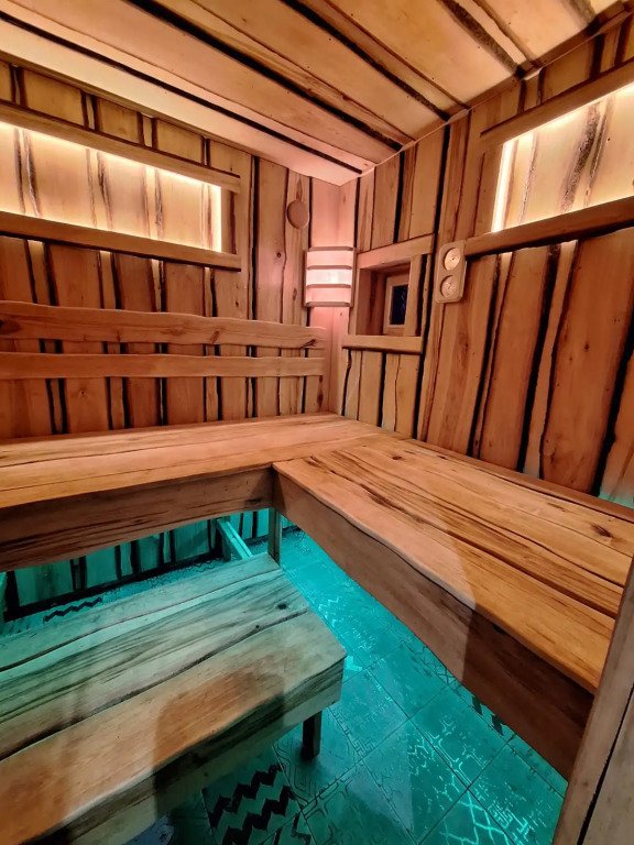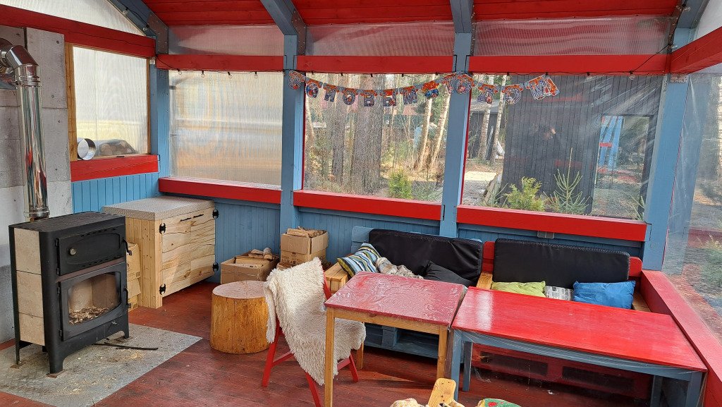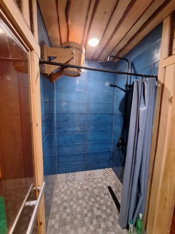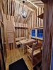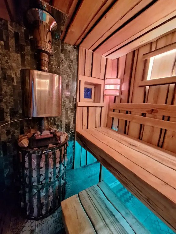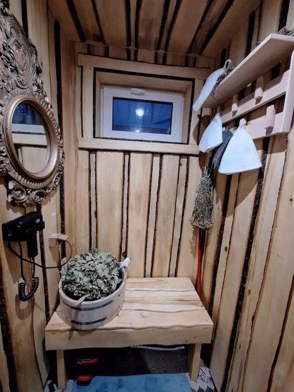 Есть баня на дровах. В бане — комната отдыха, помывочная зона и русская парная.