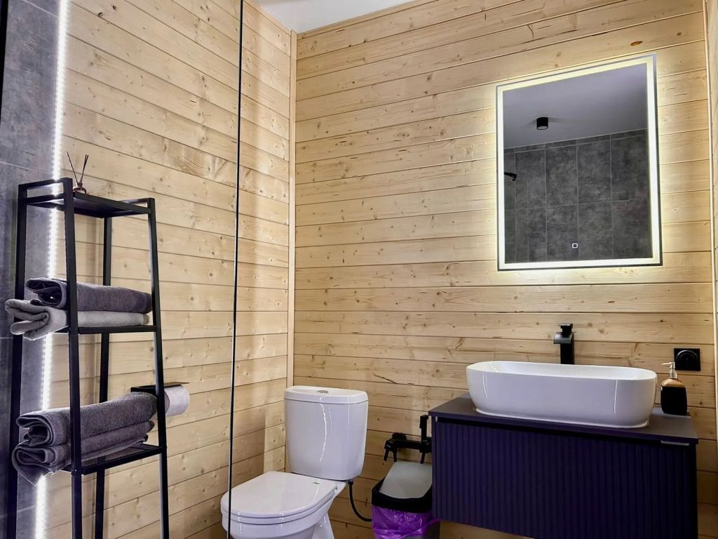 Инфраструктура: зона отдыха, полотенца, душСтильная современная баня с деревянной отделкой с панорамным окном. Идеально для отдыха на природе с парными процедурами и видами на закат.