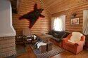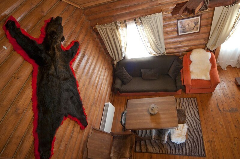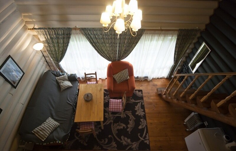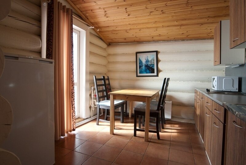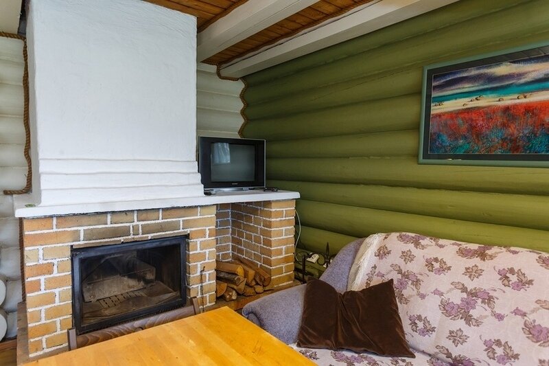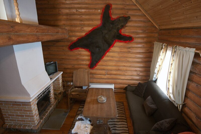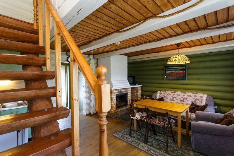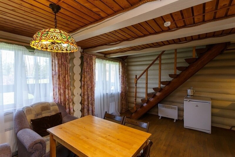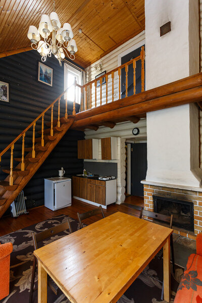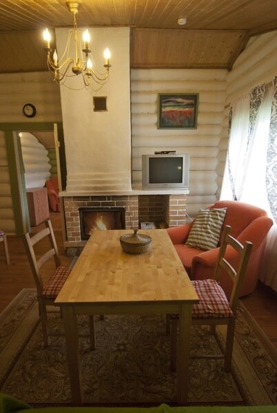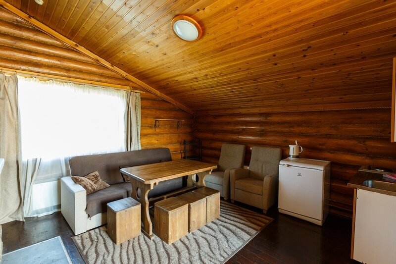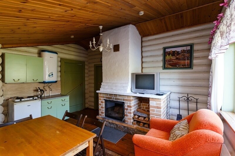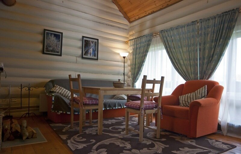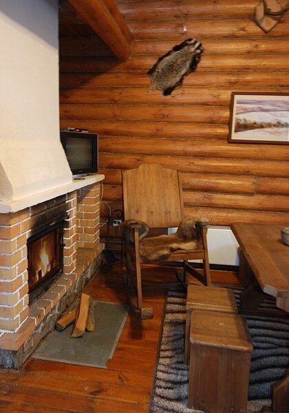 Не зависимо от декора, все коттеджи оснащены мебелью и современной бытовой техникой. В зале коттеджей, площадью около 19 кв.м с кухней и камином: ТV, диван-кровать, кресло-кровать, стол, 4 стула, камин, холодильник, кухонный гарнитур, электроплита, палас, посуда.