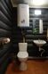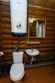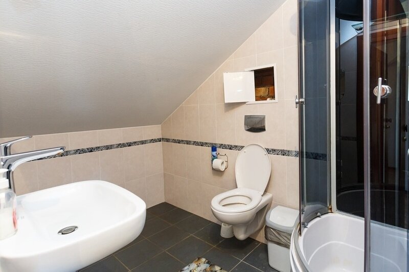В ванной комнате унитаз, раковина и душевая кабина с горячей и холодной водой.