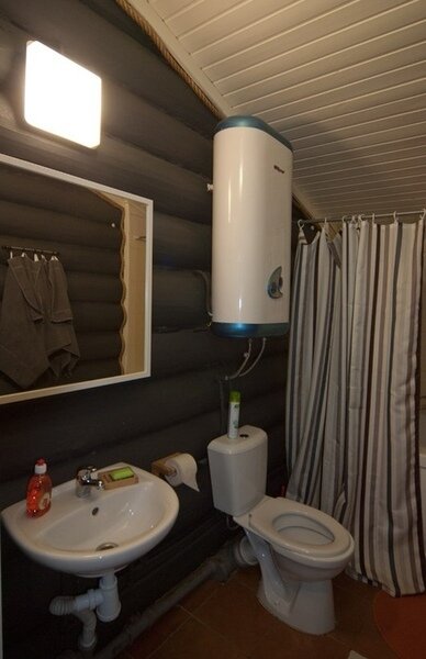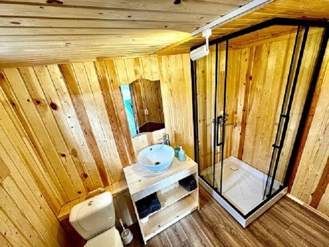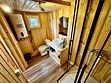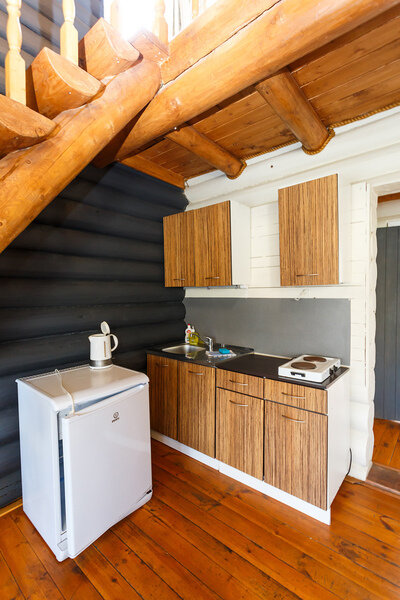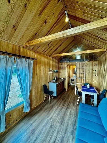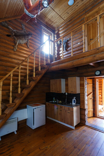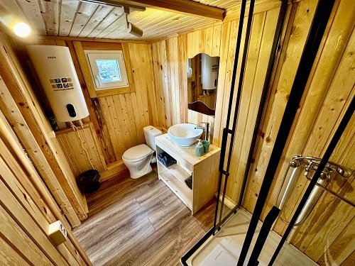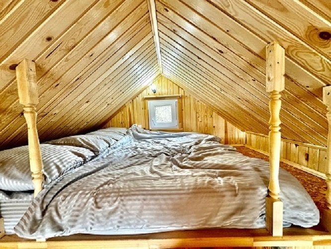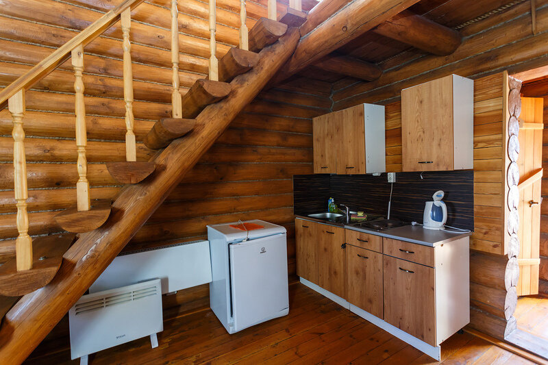 На площади в 24 квадратных метра расположилось деревянный настил для спанья с двуспальным матрасом и единой зоной гостиной комфортным двухместным диваном и панорамными окнами. Для вашего удобства его оснастили сан. узлом с душевой кабиной, холодильником, электроплиткой, чайником и телевизором. Конечно, есть wi-fi. Набор полотенец, набор посуды на 3 персоны.