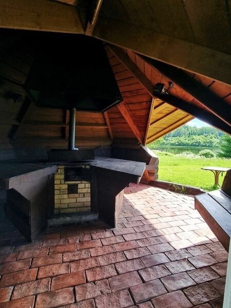 Возле каждого домика есть своя мангальная зона со столом и стульями. Также в домике есть решетка; уголь и розжиг можно приобрести у администратора, либо привезти с собой.