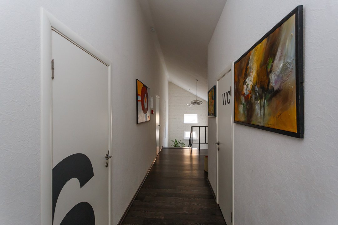 На первом этаже располагаются игровой зал и стойка администратора, которая работает круглосуточно. Номера могут быть без окон или иметь только мансардные окна. Туалет и ванная комната находятся на этаже и являются общими для всего этажа.