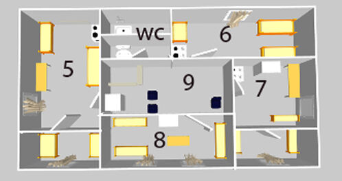Коттедж состоит из двух изолированных квартир, каждая из которых состоит из комнаты, рассчитанной на проживание двух человек и кухни с газовой плитой.