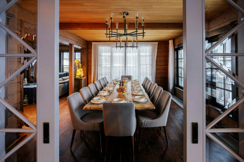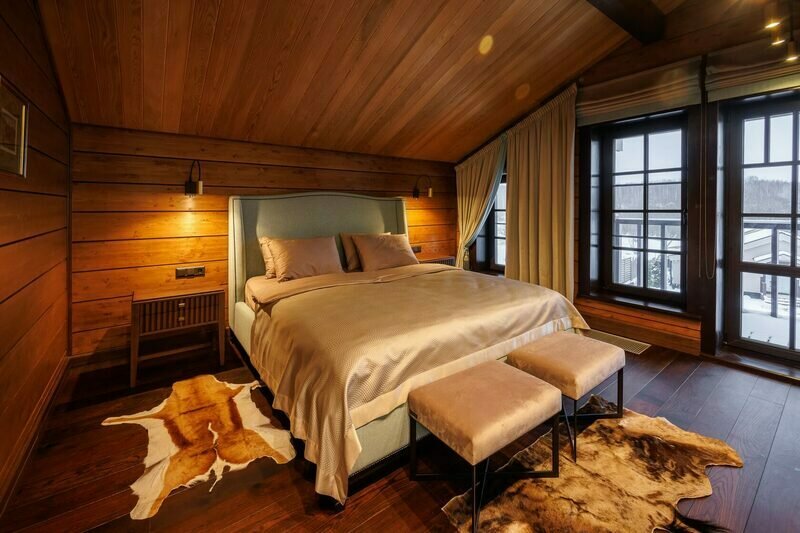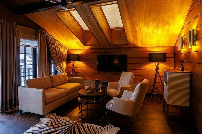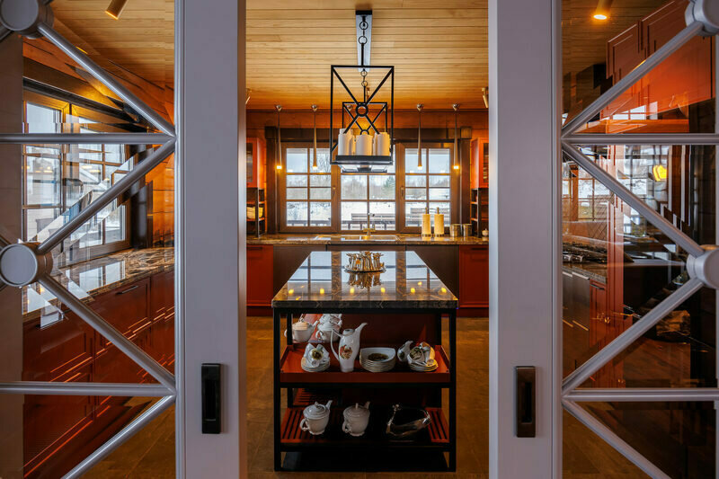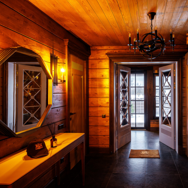 На первом этаже гостевого дома гостей «Валдайской усадьбы» встречает просторная гостиная комната с большими панорамными окнами, из которых открывается великолепный вид на первозданные леса Валдайского края. Интерьер выполнен в стиле альпийских охотничьих шале. Стены комнаты украшают трофеи из личной коллекции хозяина усадьбы.