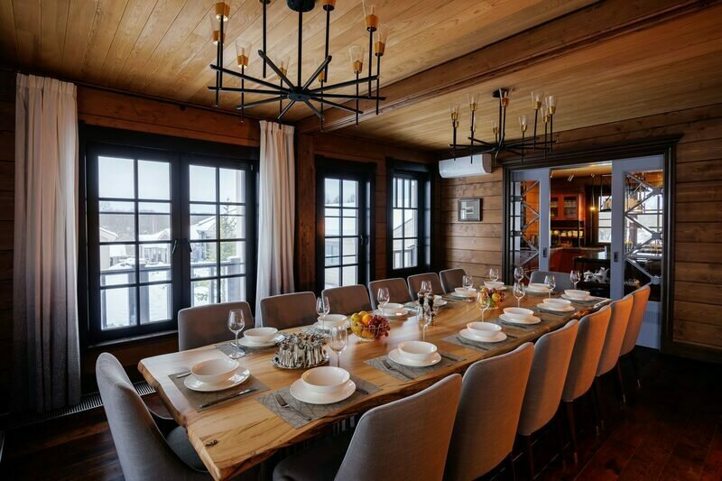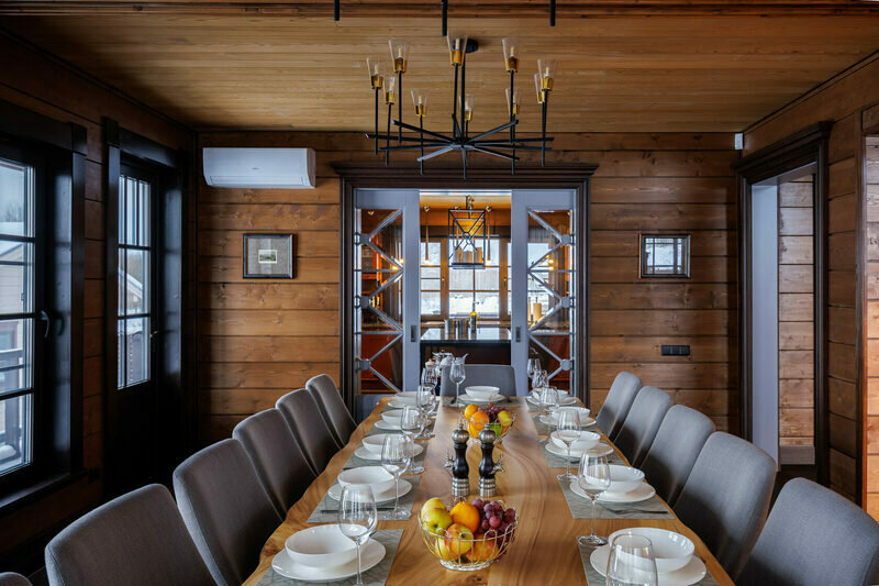На первом этаже большого гостевого дома располагается просторная и светлая столовая комната, где с комфортом могут разместиться до 14 персон.