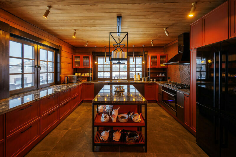 Рядом со столовой комнатой обустроена большая и полностью оборудованная современная кухня, в которой при желании вы можете приготовить еду самостоятельно.