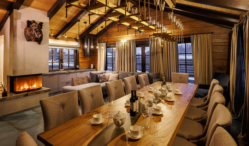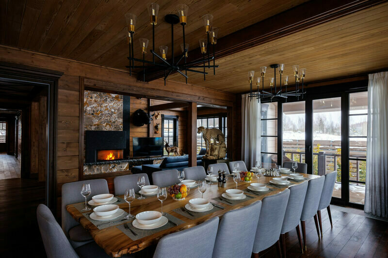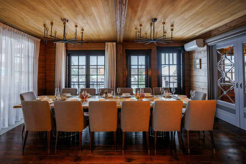 Помимо привычных для всех любителей банных процедур аксессуаров и предметов интерьера, здесь вас ожидают мягкие диваны с отделкой из натуральных тканей, создающей ощущение уюта и расслабленности, большой обеденный стол из массива дерева, комфортные дизайнерские кресла и камин из натурального мрамора, который обязательно согреет вас даже самыми долгими и холодными зимними вечерами.