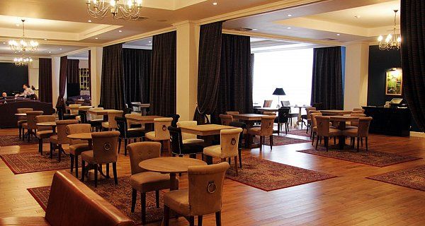 - Английская комната, где вы сможете провести деловые переговоры с партнерами или устроить ужин в узком кругу. Кожаные диваны "Честерфилд" с низкой спинкой, диванные подушки, изящные столы – интерьер Английского зала располагает к спокойному деловому общению и погружению в атмосферу старой доброй Англии.