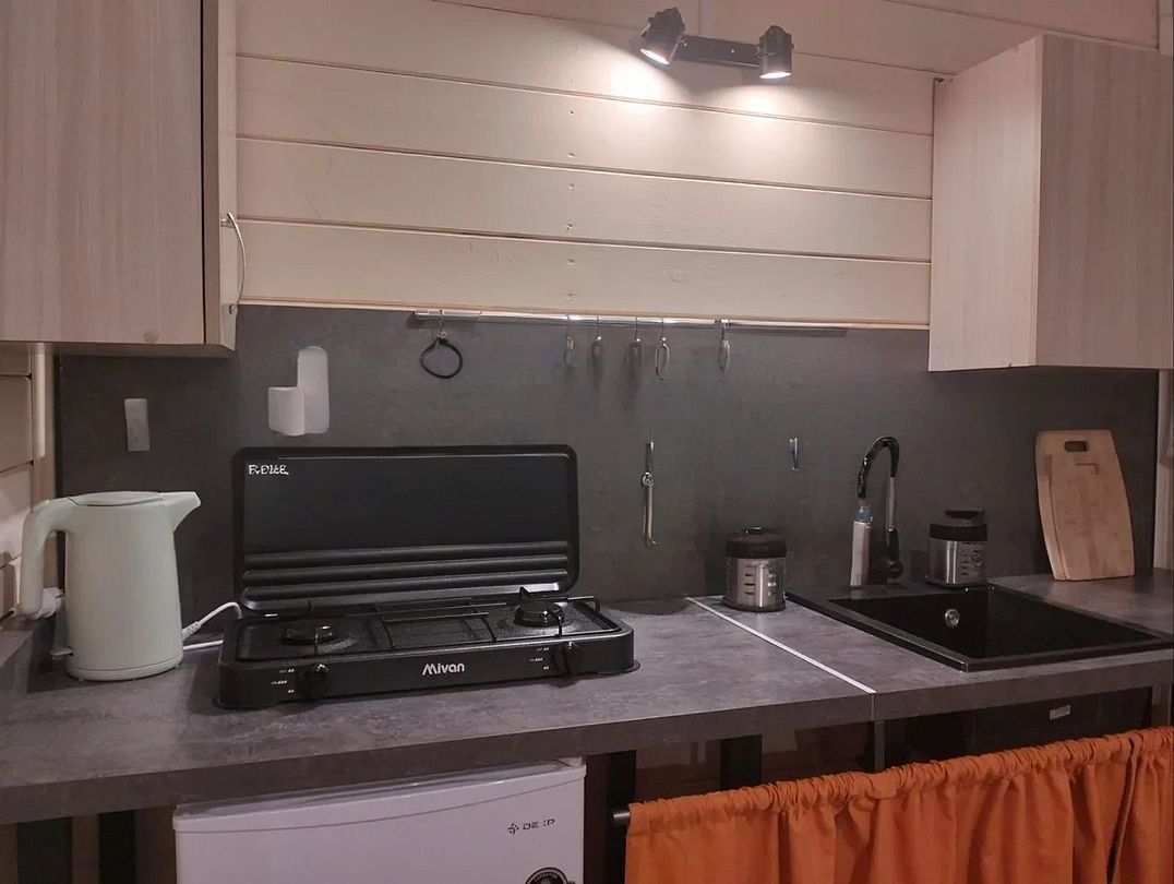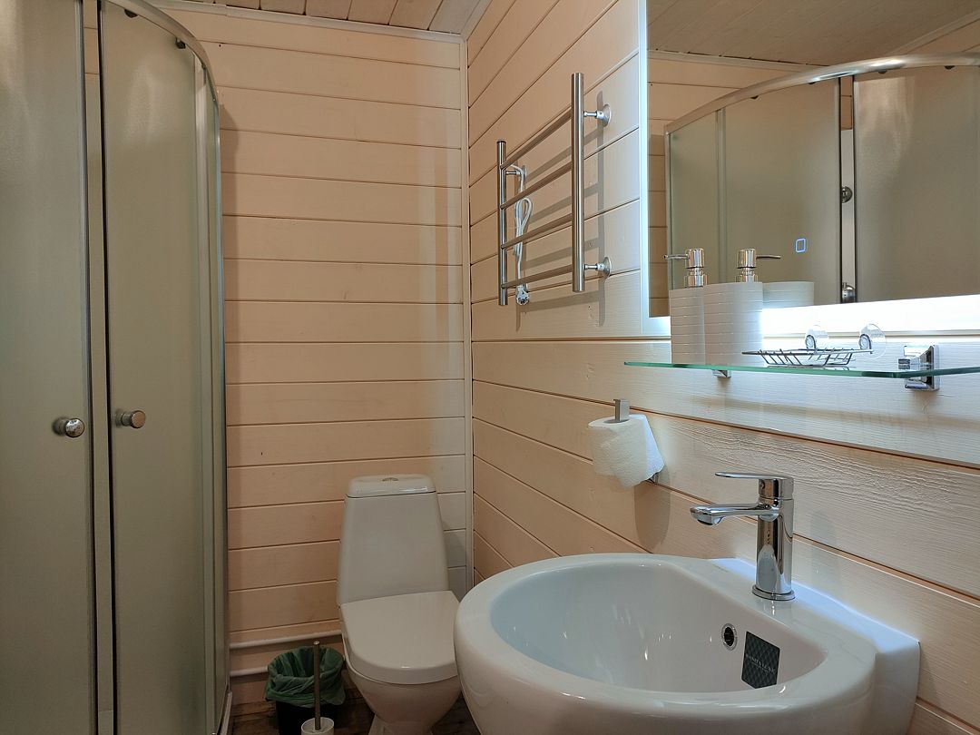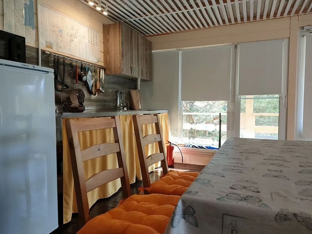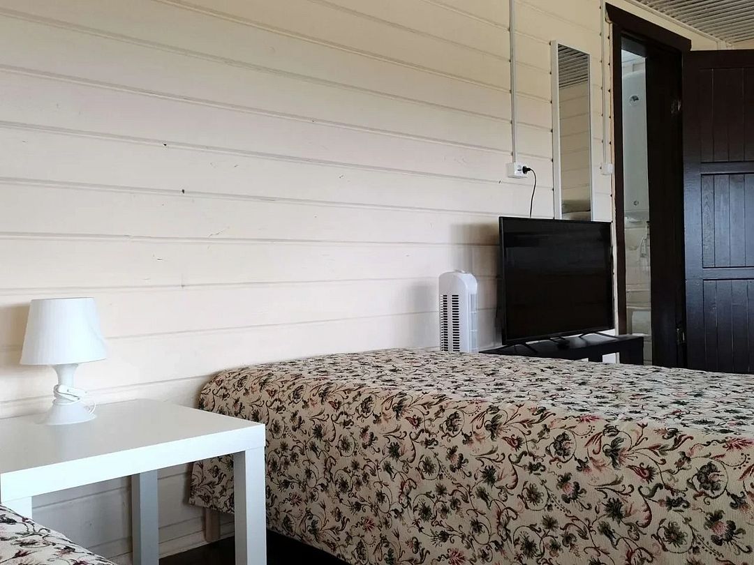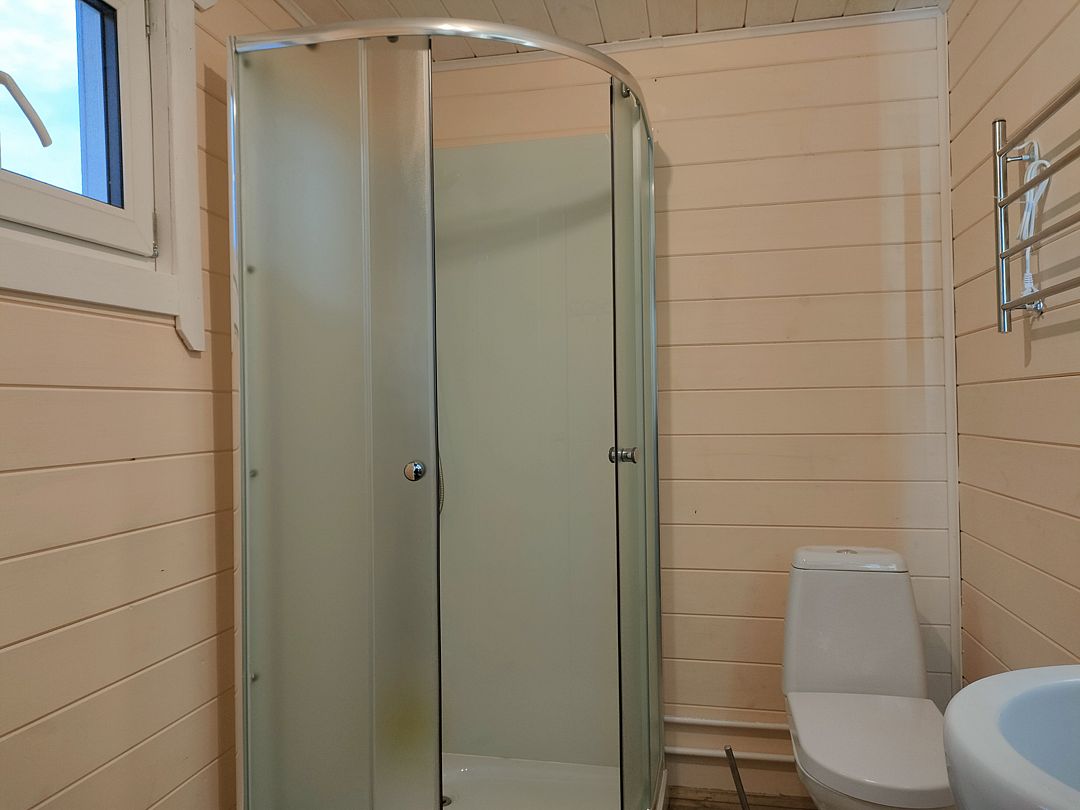 В каждой комнате по четыре кровати и по дивану, есть кухни и всё необходимое для приготовления еды, газовая плита, посуда, холодильники, комнаты светлые, окна в пол, сантехника новая. В домике усилитель мобильной связи и интернета.