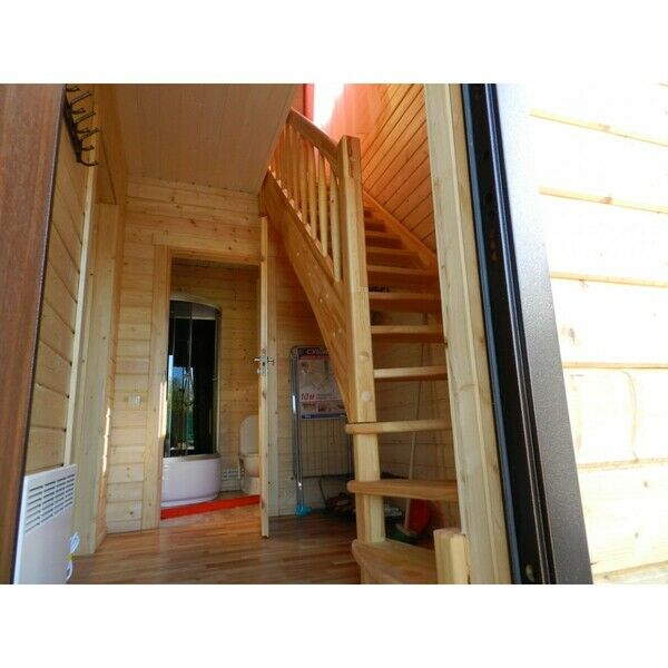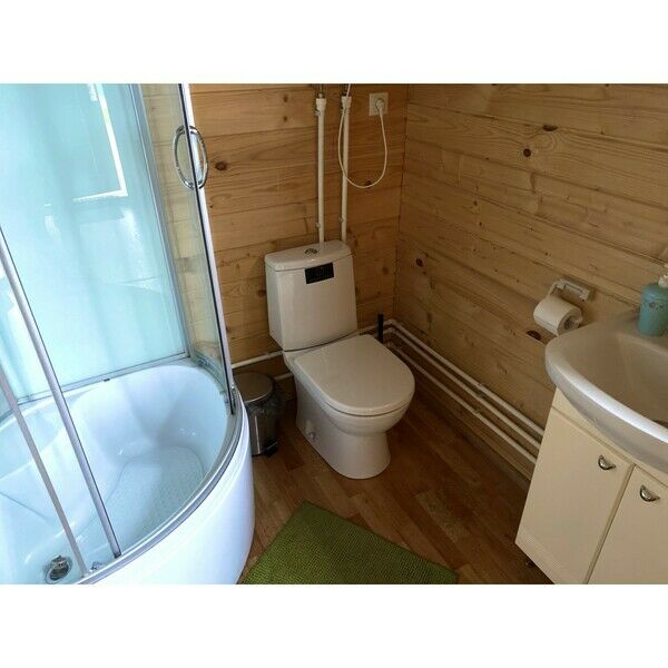 Отдельная зона прихожей и туалетной комнаты, создает комфортное пребывание в большой гостиной с телевизором, обеденным столом и двухместным диваном. Высокие потолки и светлые окна дают ощущения легкости и простора. Современные технологии эл.конвекторов, позволяют контролировать тепло и наслаждаться домашним уютом в любое время года. Из кухни, винтовая лестница проведет Вас на второй этаж, где расположены холл с раздвижным диваном и четыре спальных места на две комнаты, по два в каждой.