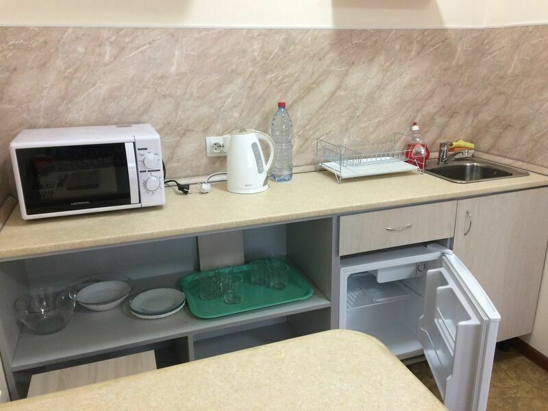 прихожая, санузел с душем, туалетные принадлежности, мини-кухня, стол,
