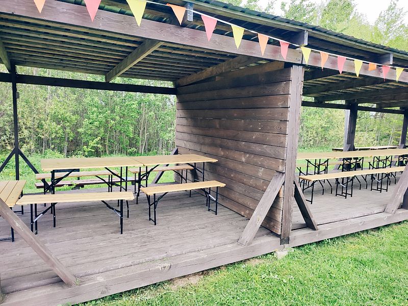 Территория идеально подходит для выездных свадебных регистраций, банкетных мероприятий и активных развлечений, которые можно организовать по индивидуальному плану. В беседке установлены электрические конвекторы для обогрева, а также есть стационарный туалет и возможность подключения электроприборов.