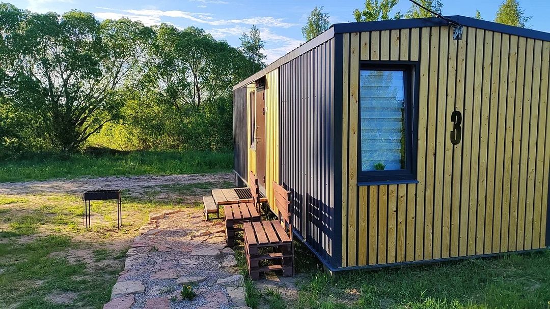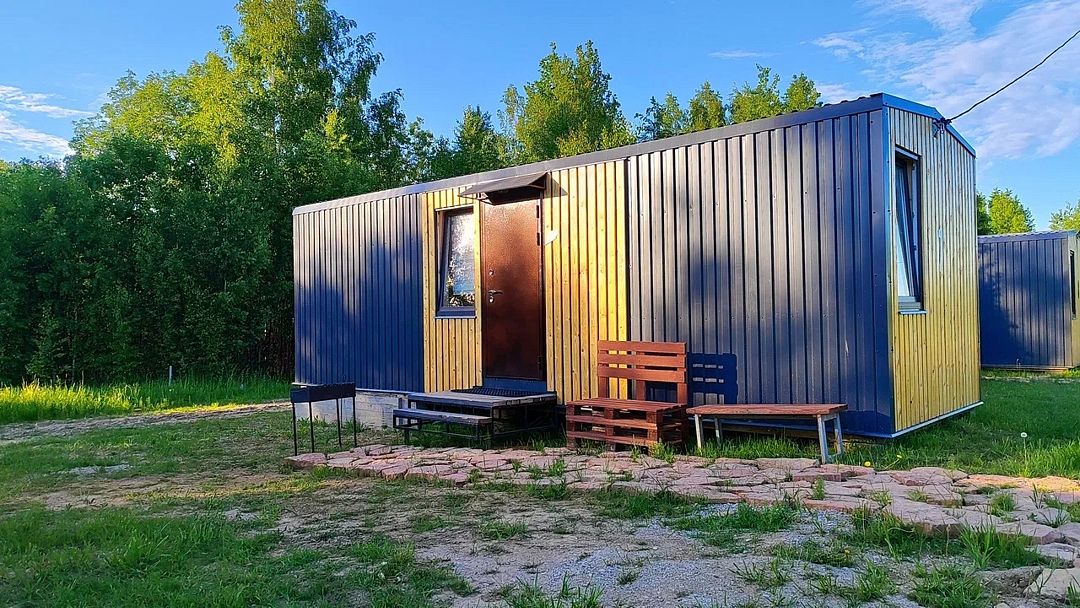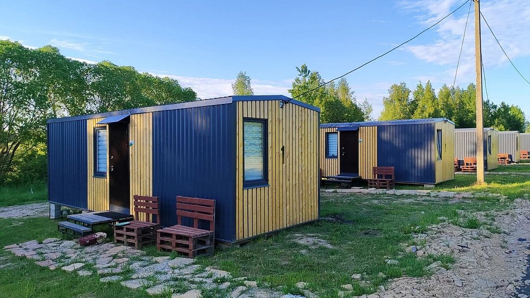 В санузле — душевая кабина, туалет, раковина, набор полотенец для каждого гостя, зеркало, фен, ручной отпариватель по запросу. У каждого дома своя площадка с уличной мебелью и мангалом (угли, шампура и розжиг можно купить на месте). По всей территории работает WiFi.