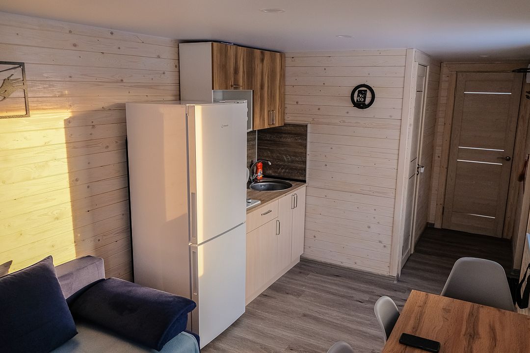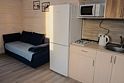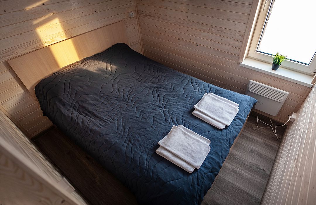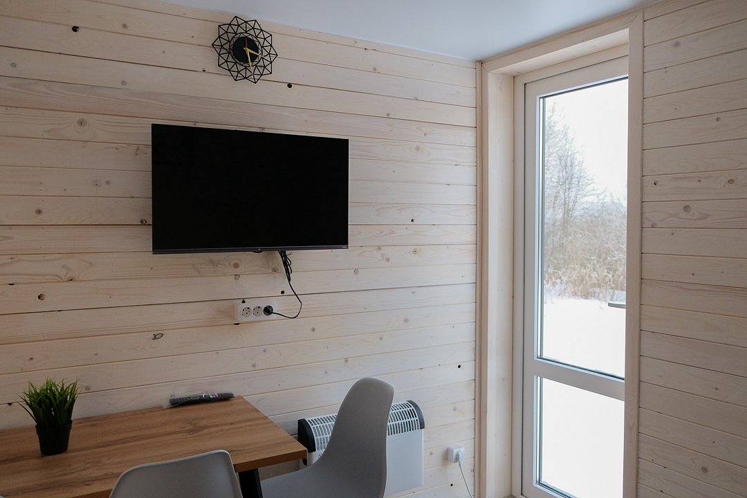 В семейном мини доме двуспальная кровать (сто восемьдесят на двести сантиметров), жалюзи, отопление, вешалка для вещей, раскладной диван для двух гостей (в кухонной зоне), бесплатный wi-fi, Smart TV и кондиционер.