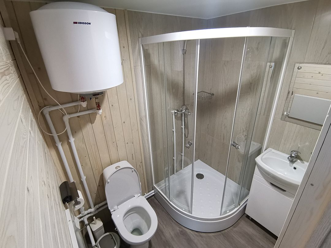 В санузле — душевая кабина, туалет, раковина, набор полотенец для каждого гостя, зеркало, фен, ручной отпариватель по запросу.