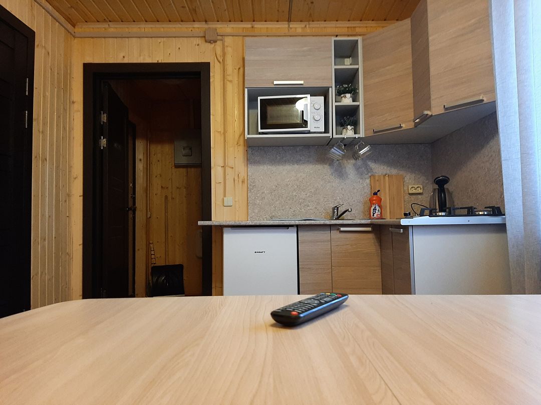 На кухне холодильник с морозильным отсеком, чайник, микроволновка, газовая поверхность, комплект посуды и столовых приборов на четыре гостя, обеденный стол и шесть стульев (дополнительные предоставляются по запросу).