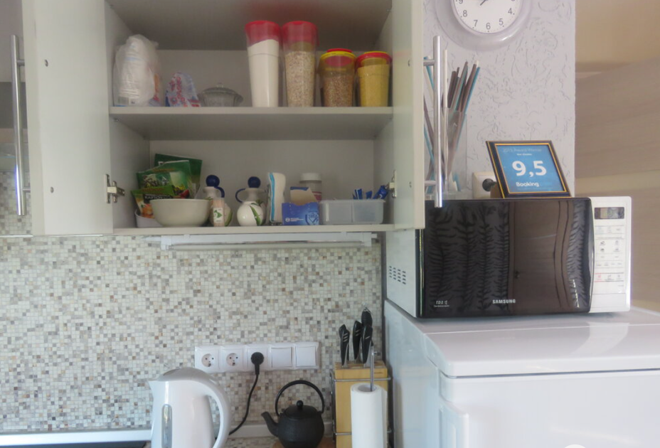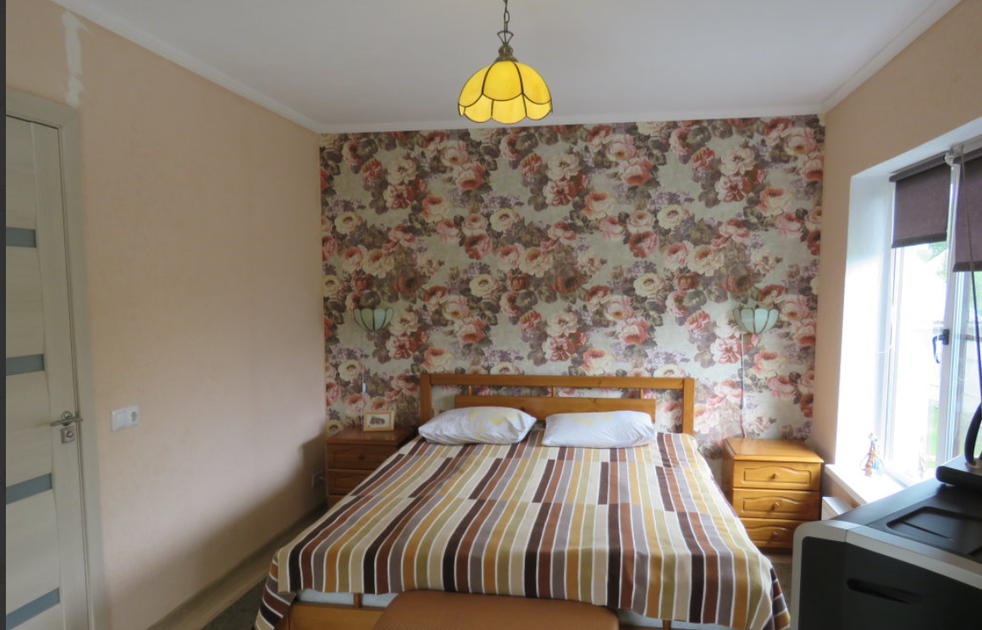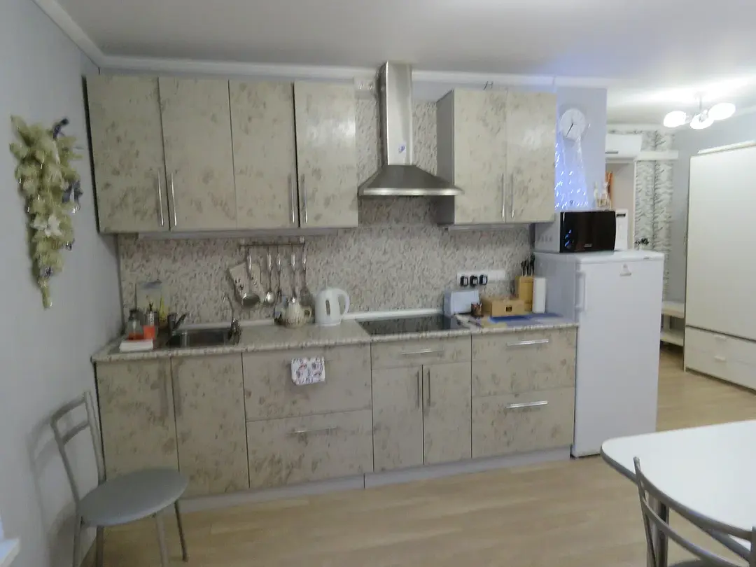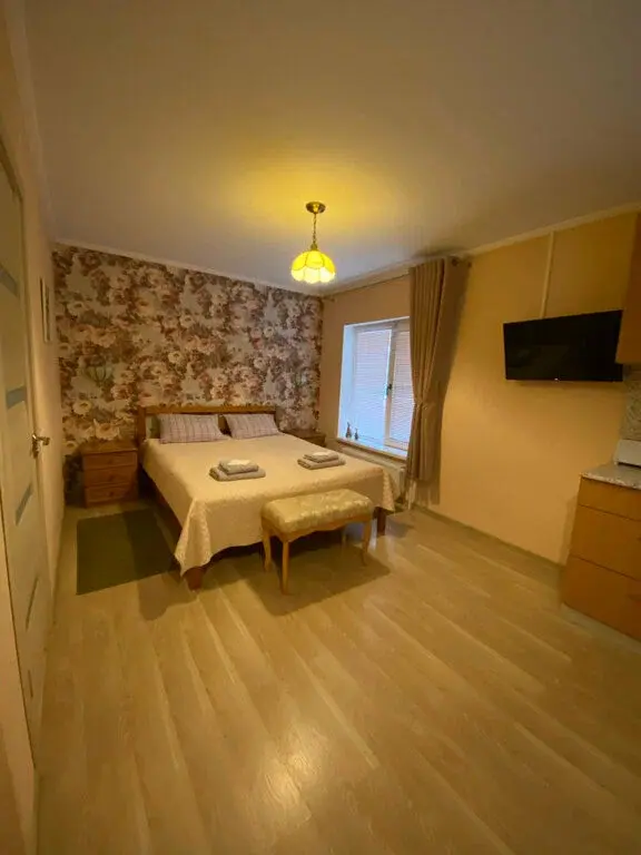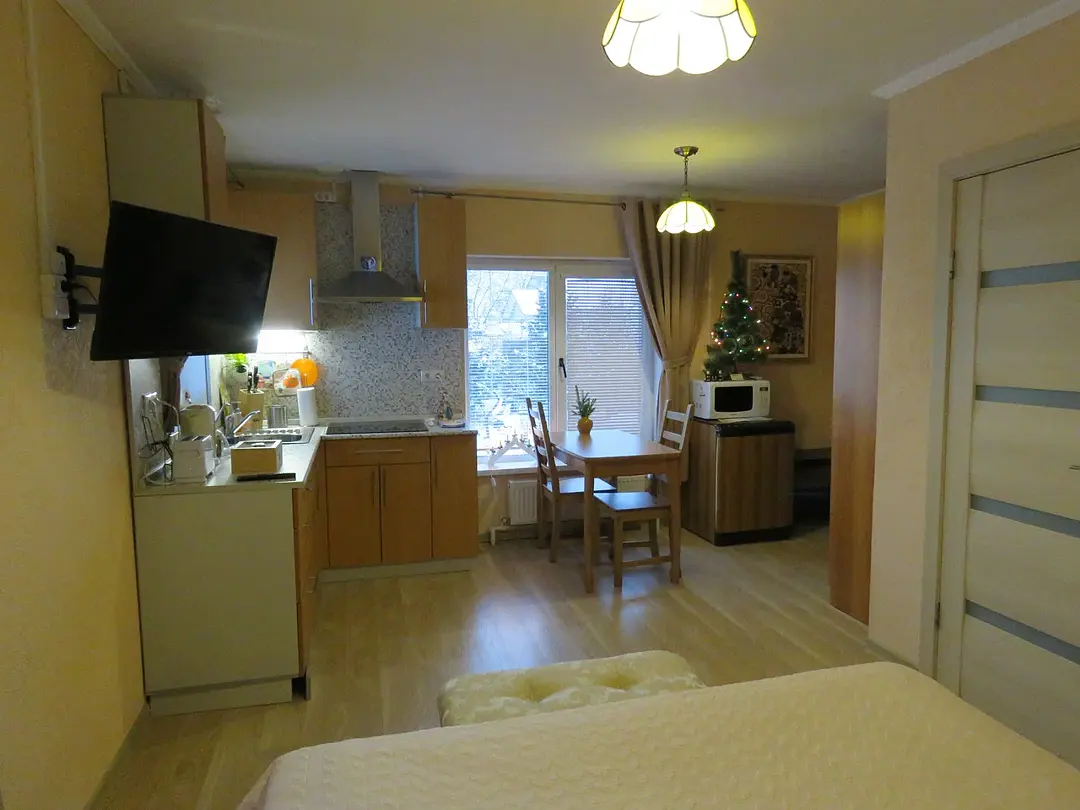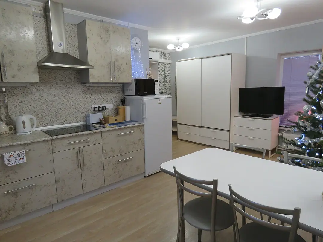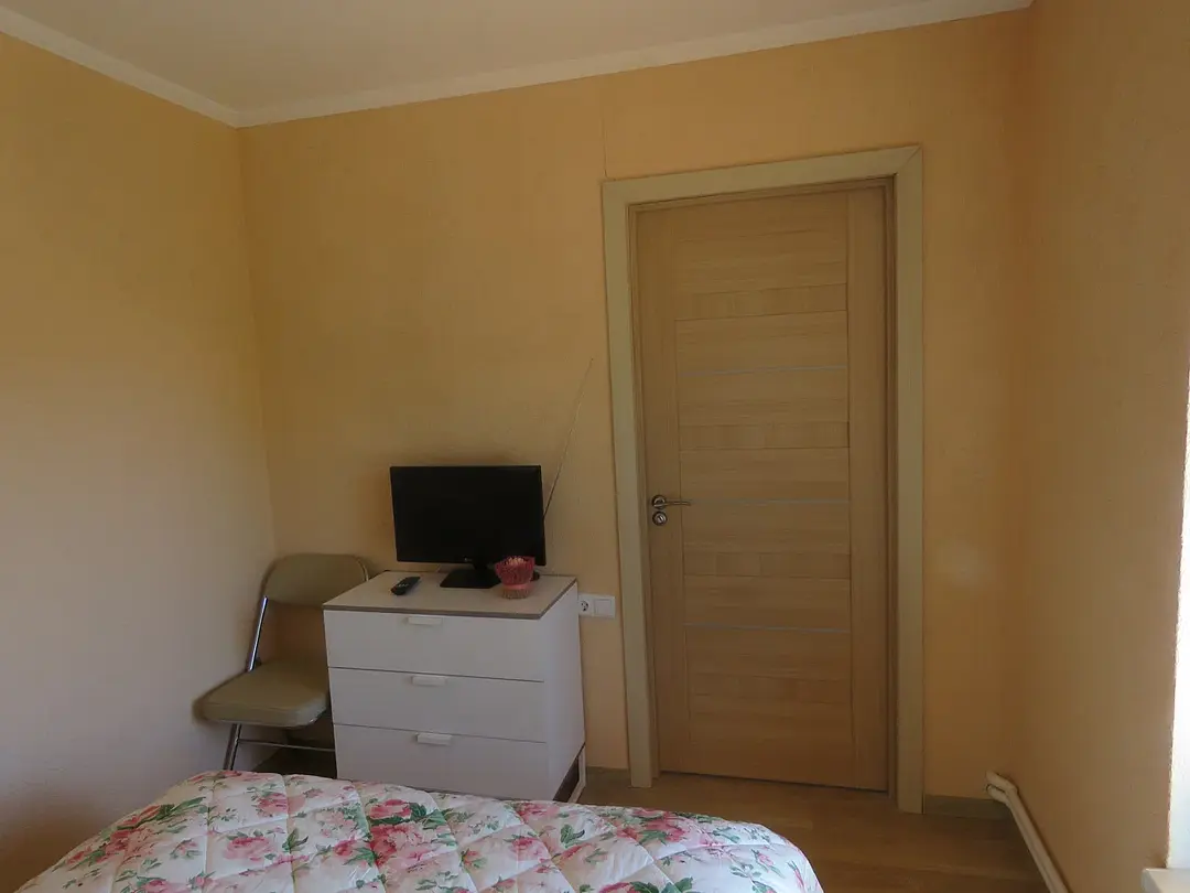 1 гостевой номер 25 кв.м студийного типа на двух человек: шкаф-купе, двуспальная кровать, 2 прикроватные тумбочки, банкетка, ночные светильники, тумбочка под телевизор, телевизор, стулья, обеденный стол), кухонный гарнитур, электрическая плита, вытяжная система, холодильник, микроволновая печь, электрический чайник, полный набор посуды для приготовления пищи и еды, столовые приборы, чай, сахар и т.д.), санузел (испанская сантехника: душевая кабина 140х90, унитаз, биде, туалетный столик с зеркалом, фен, набор полотенец, туалетная бумага и т.д.). Кроватка малышу(бесплатно), по запросу возможна установка дополнительной кровати в номере.