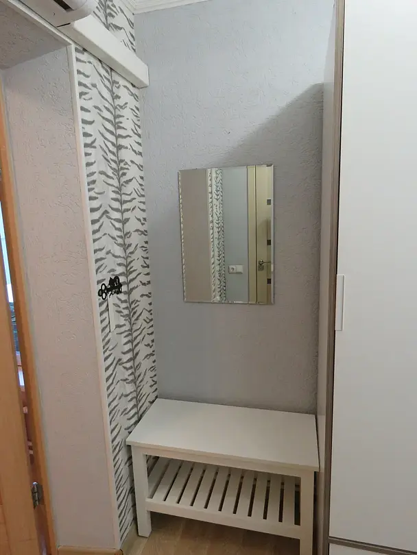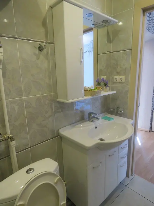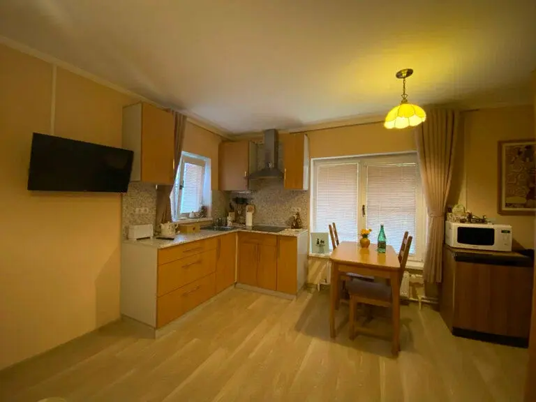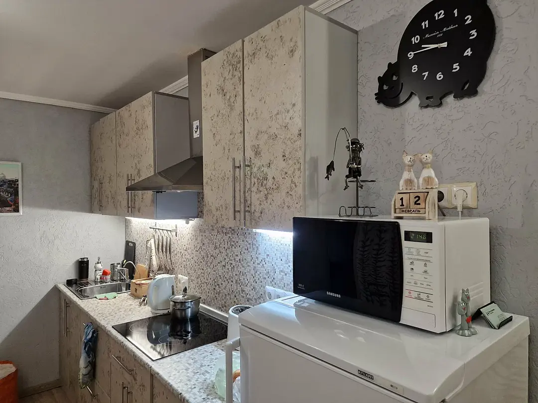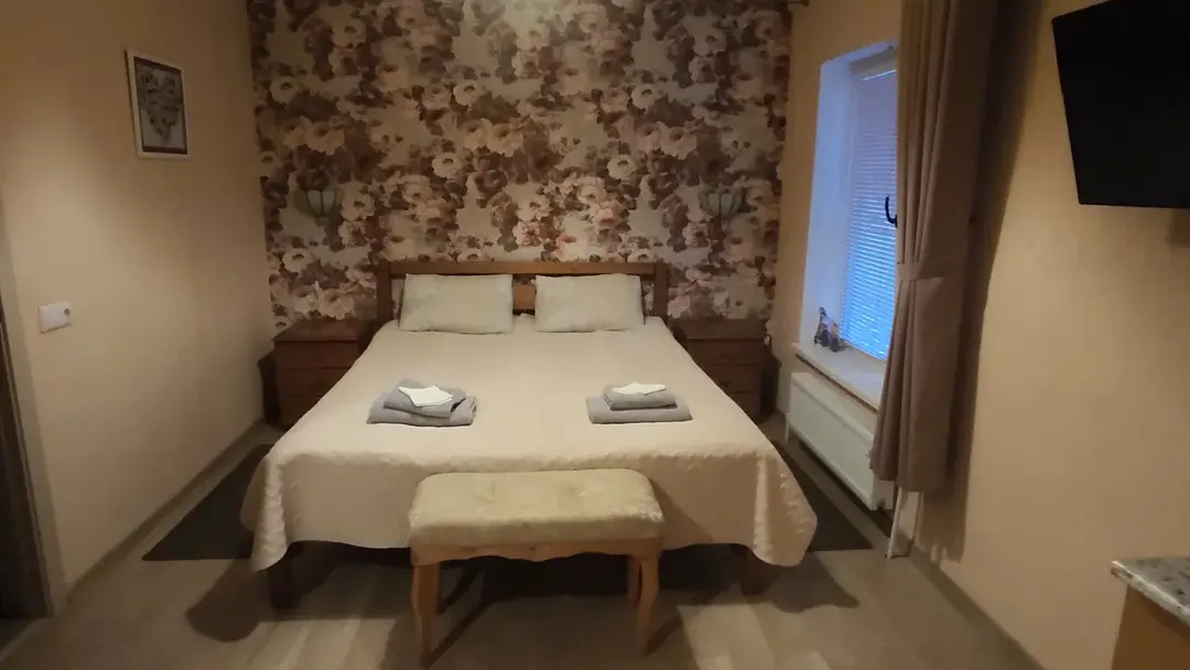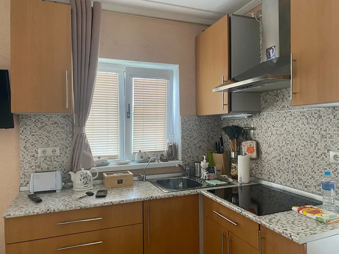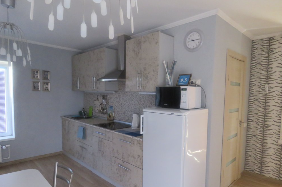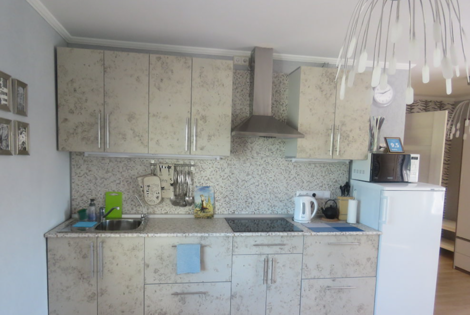 1 гостевой номер 25 кв.м студийного типа на двух человек: шкаф-купе, двуспальная кровать, 2 прикроватные тумбочки, банкетка, ночные светильники, тумбочка под телевизор, телевизор, стулья, обеденный стол), кухонный гарнитур, электрическая плита, вытяжная система, холодильник, микроволновая печь, электрический чайник, полный набор посуды для приготовления пищи и еды, столовые приборы, чай, сахар и т.д.), санузел (испанская сантехника: душевая кабина 140х90, унитаз, биде, туалетный столик с зеркалом, фен, набор полотенец, туалетная бумага и т.д.). Кроватка малышу(бесплатно), по запросу возможна установка дополнительной кровати в номере.