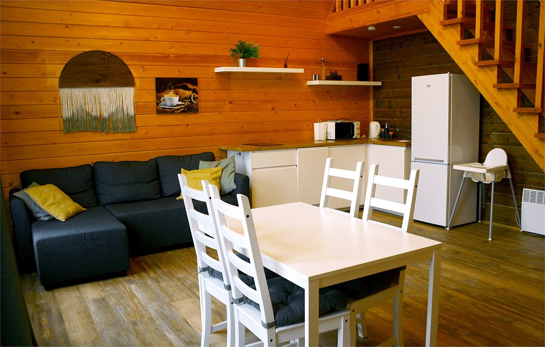 В домике есть все необходимое для комфортного проживания, хороший wifi, 2 удобные кровати и диван, 2 туалета, хорошо оборудованная кухня и при этом полно свободного пространства. По запросу предоставляется детская кроватка. Чего не хватает, так это блокирующих свет штор. У каждого домика свой мангал.