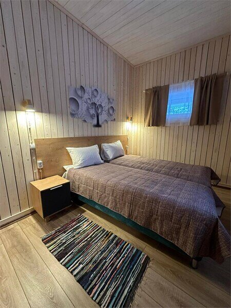 Домик на шестерых с возможностью дополнительного размещения, две спальни с модульными кроватями, + 2-х местный диван в гостиной. Возможно дополнительное размещение, максимальное количество человек в номере – 8.