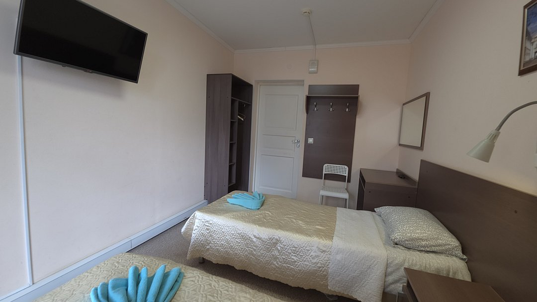 Двухместный номер с двумя отдельными кроватями, телевизором с плоским экраном, тумбой, вешалкой и письменным столом. Душ и туалет общего пользованияВ номере