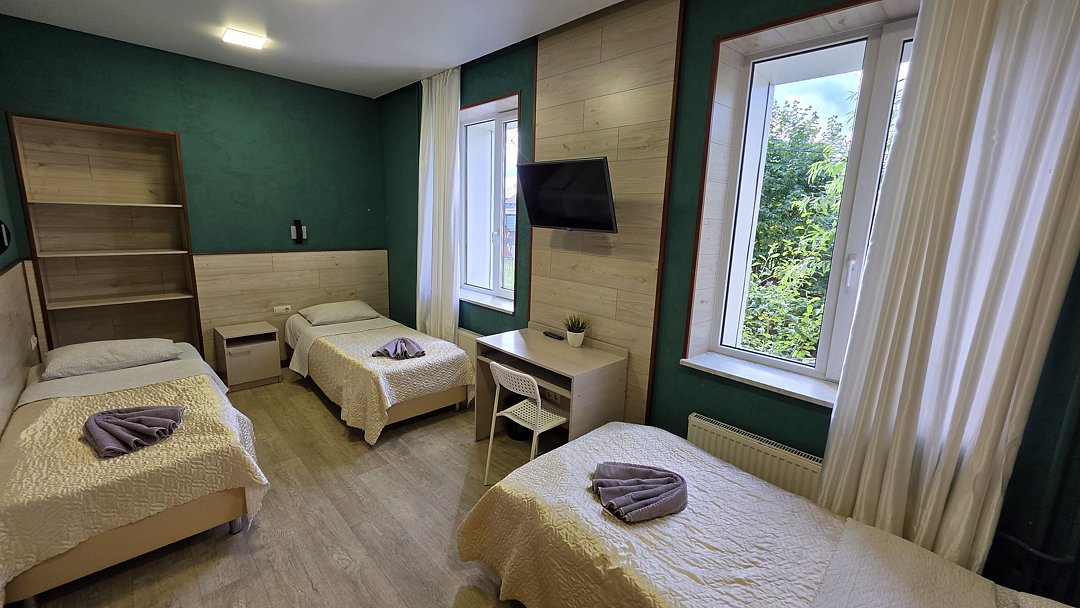 Улучшенный трехместный номер с одной двуспальной кроватью,одной односпальной кроватью и двуспальным диваном, телевизором с плоским экраном, шкафом, тумбой и письменным столом. Душ и туалет общего пользованияВ номере