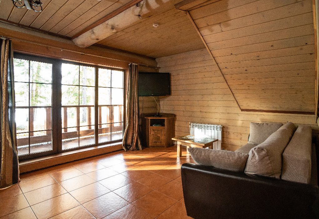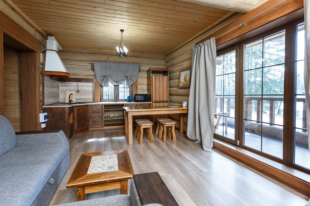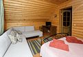 Коттедж на 4 места — уютный рубленный деревянный дом с авторской мебелью ручной работы, выполненный полностью из экологически чистых материалов. Все дома расположены на берегу озера, потому из их панорамных окон открывается чудесный вид! Имеется бесплатный Wi-Fi.