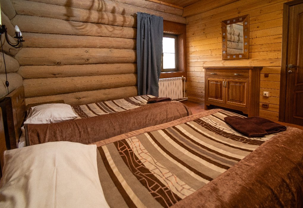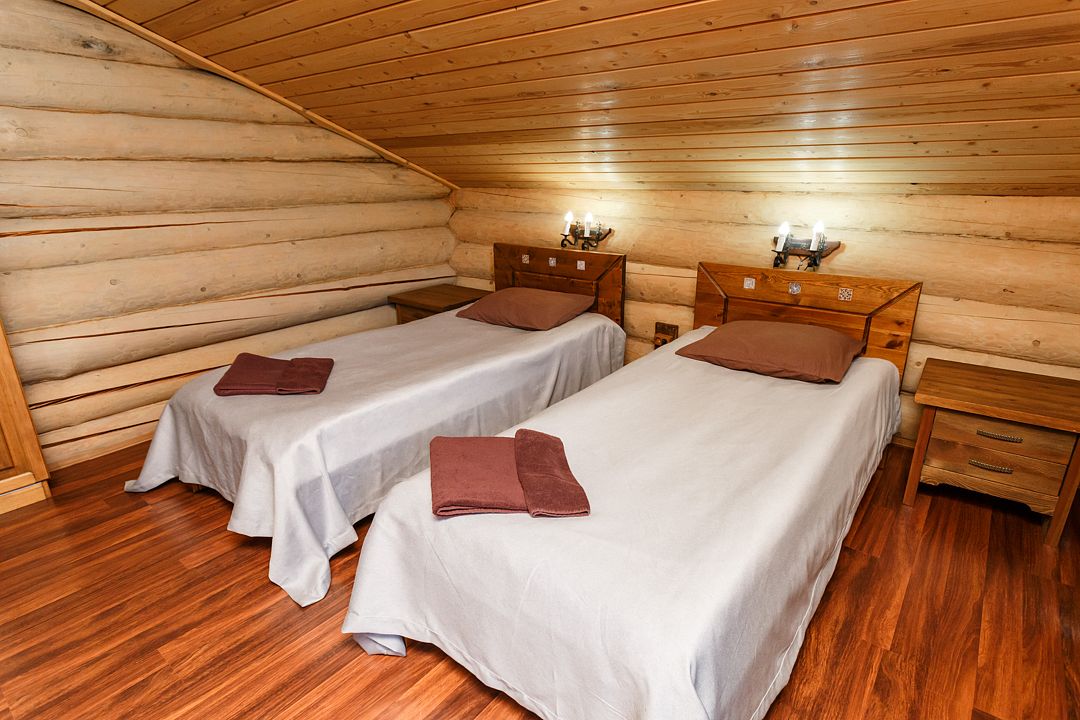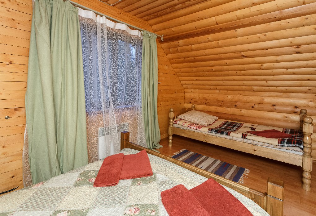 Коттедж на 4 места — уютный рубленный деревянный дом с авторской мебелью ручной работы, выполненный полностью из экологически чистых материалов. Все дома расположены на берегу озера, потому из их панорамных окон открывается чудесный вид! Имеется бесплатный Wi-Fi. В 4-местном доме, первый этаж: прихожая, холл, санузел с душевой кабиной, спальня с кроватями-трансформерами, большая кухня-гостиная; второй этаж: холл с двумя раскладными креслами, спальня с кроватями-трансформерами, санузел с душевой кабиной. TV в комнатах. На каждом этаже большое окно с выходом на балкон.