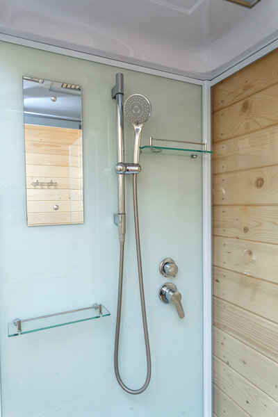 В 4-местном доме, первый этаж: прихожая, холл, санузел с душевой кабиной, спальня с кроватями-трансформерами, большая кухня-гостиная; второй этаж: холл с двумя раскладными креслами, спальня с кроватями-трансформерами, санузел с душевой кабиной. На каждом этаже большое окно с выходом на балкон.