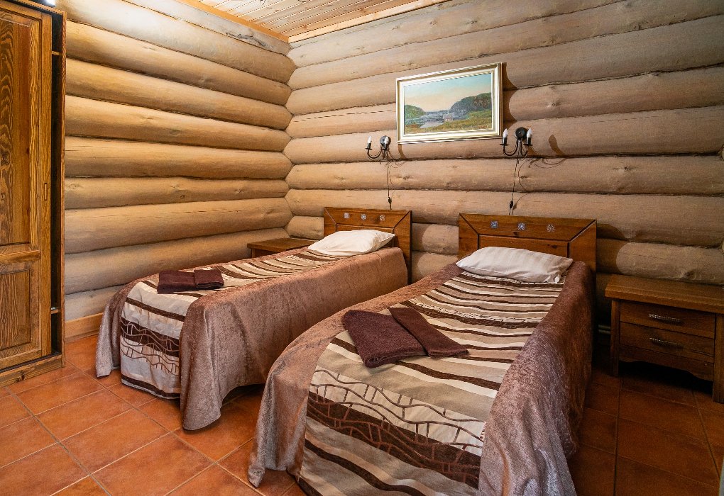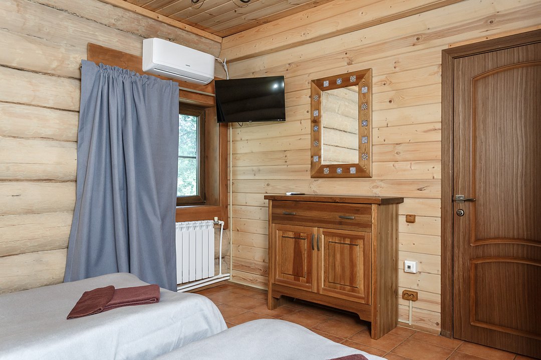 Коттедж состоит из 2 номеров с разными входами, первый либо второй этаж. В каждом номере: прихожая, холл, санузел с душевой кабиной, спальня с двумя односпальными кроватями, кухня-гостиная.