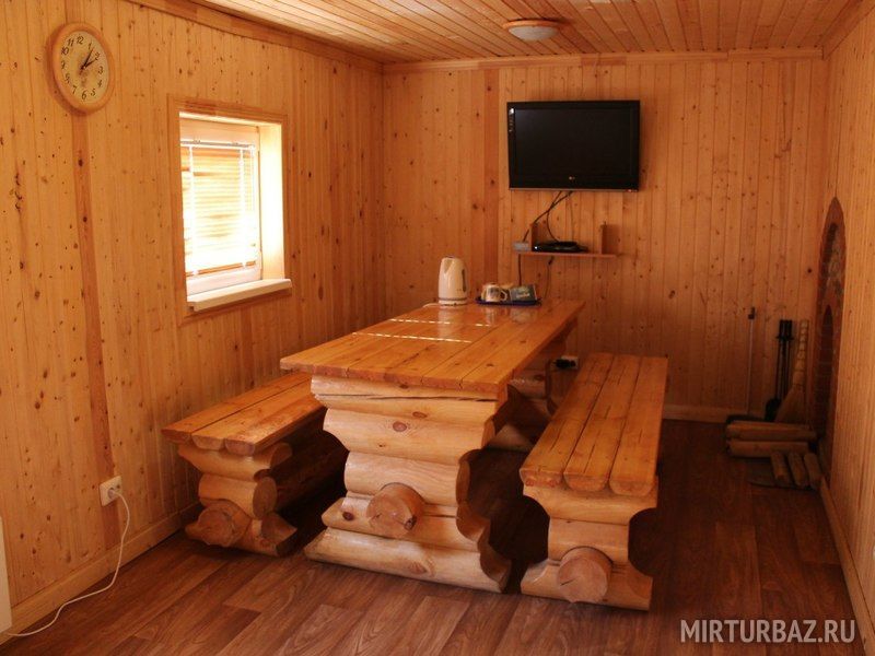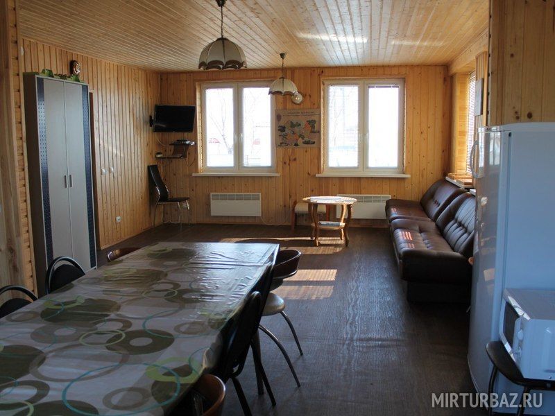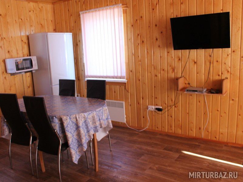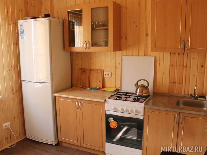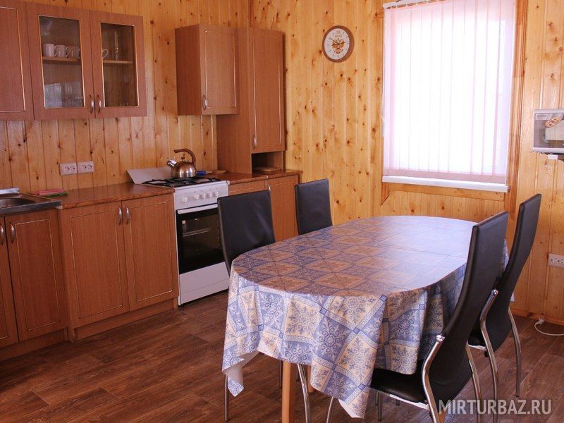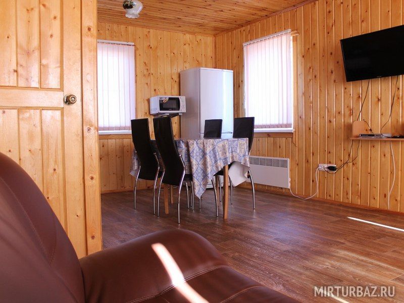 Гостиная, совмещенная с кухонным блоком, дает возможность всем гостям наслаждаться совместным приготовлением пищи, для чего имеется вся необходимая посуда, газовая плита, микроволновая печь, холодильник, морозильная камера для хранения улова.