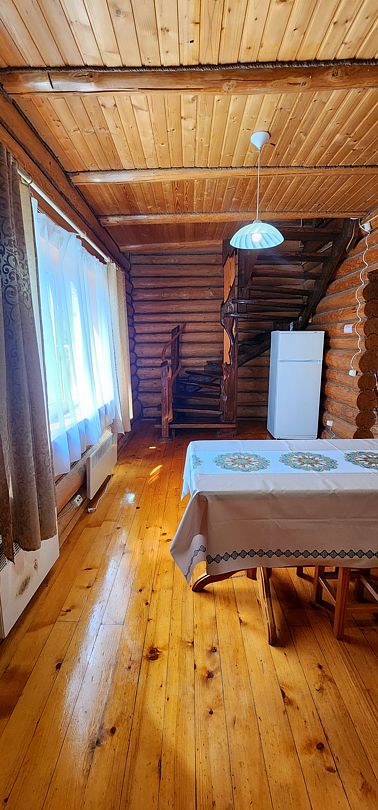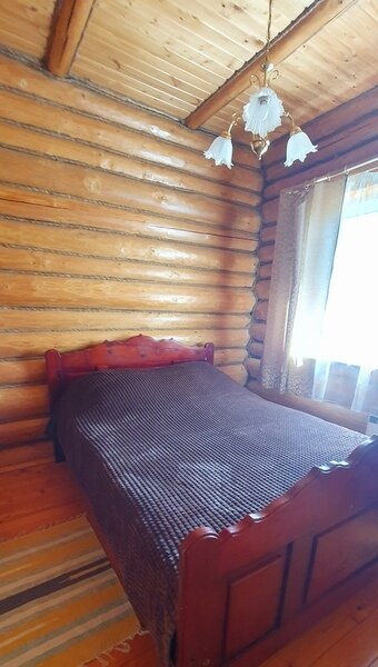 На первом этаже спальня с двуспальной кроватью, на втором этаже — спальня с пятью односпальными кроватями. 7 спальных мест. У дома открытая веранда и мангал.