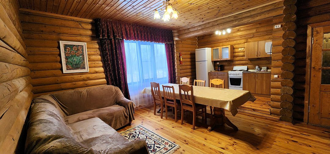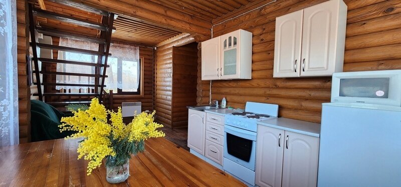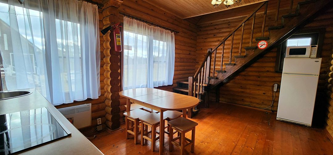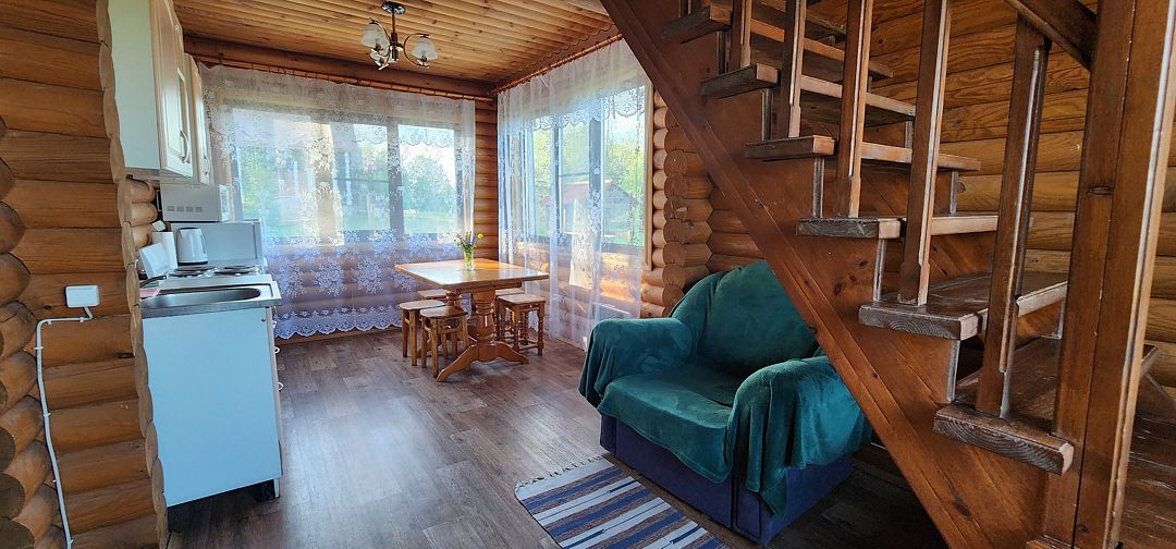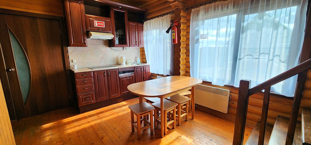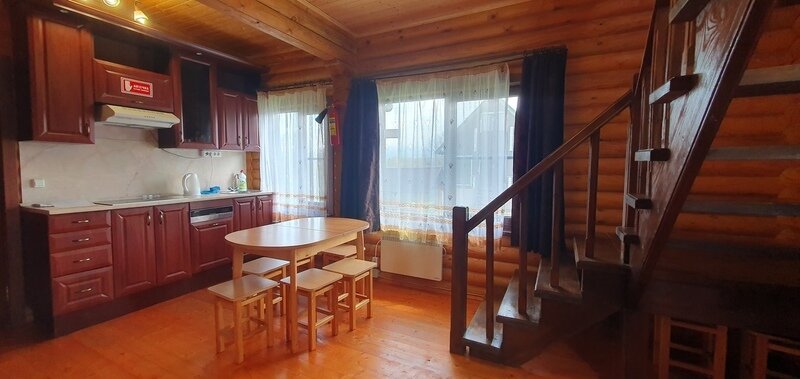 На первом этаже спальня с двуспальной кроватью, на втором этаже — спальня с двуспальной кроватью и спальня с двуспальной кроватью и креслом-кроватью, в столовой зоне двуспальный диван. Основных мест 6, дополнительно 3 места. Максимальное количество гостей 9. У дома своя беседка и мангал.