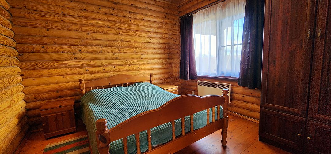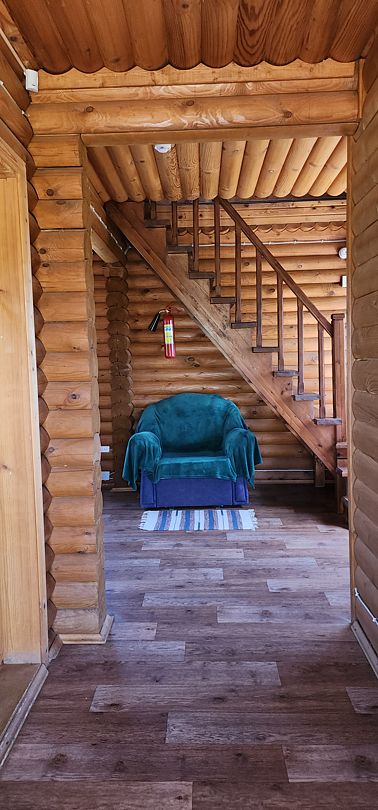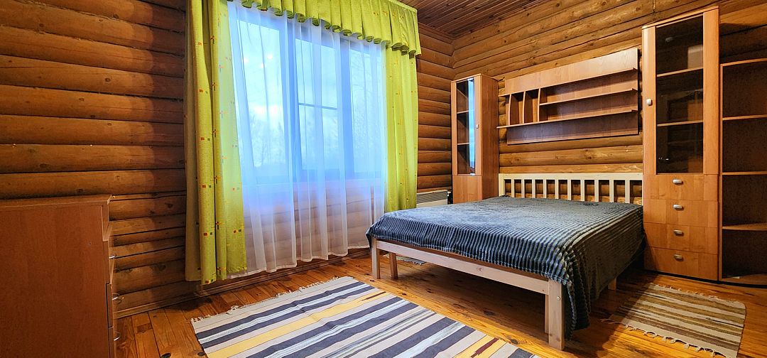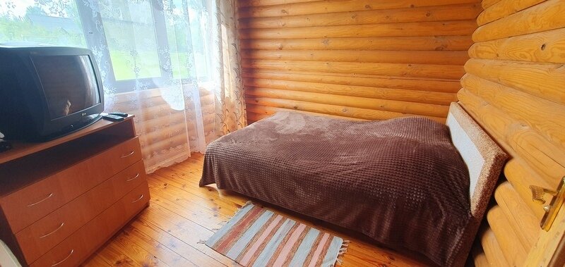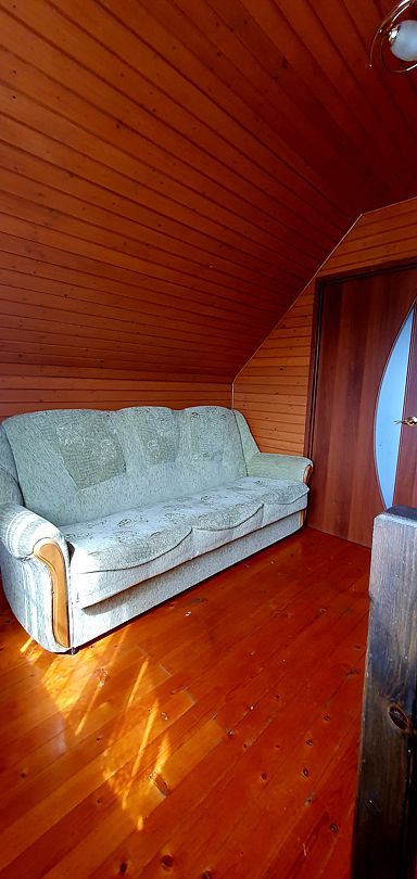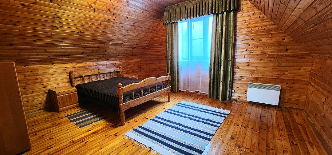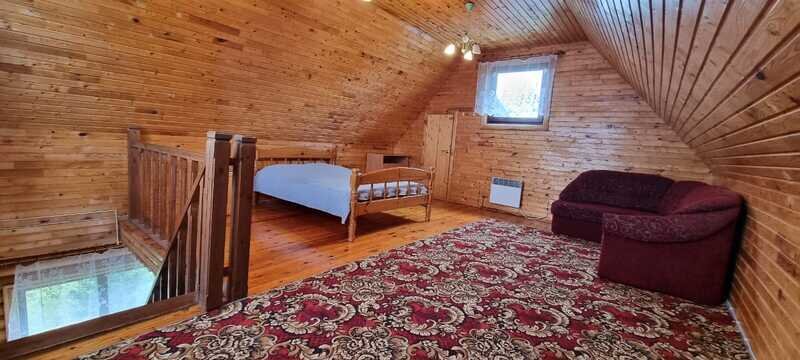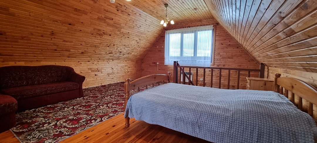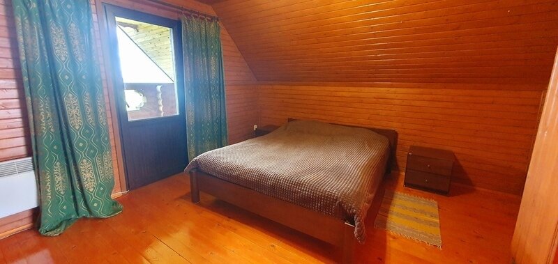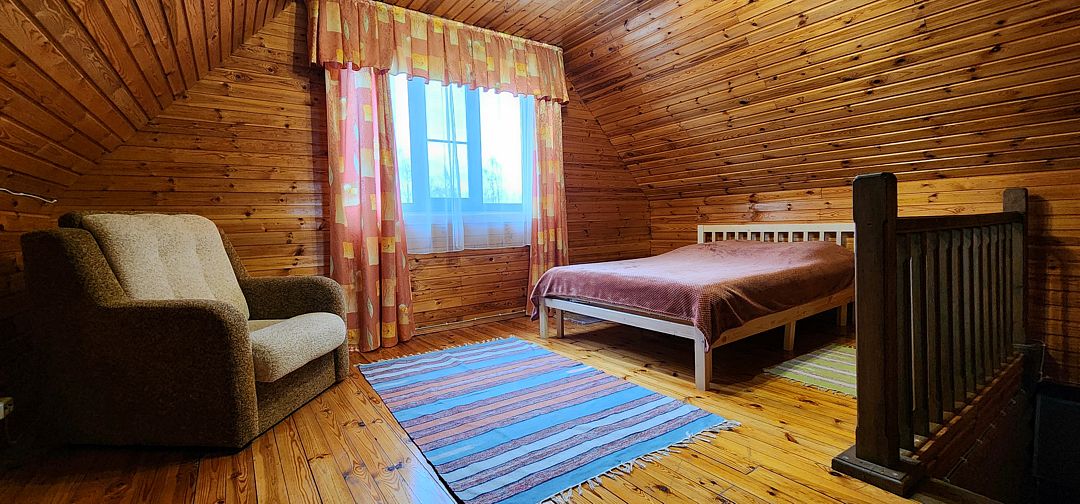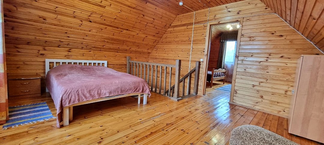На первом этаже спальня с двуспальной кроватью, на втором этаже — спальня с двуспальной кроватью и двуспальным диваном. 6 спальных мест. У дома своя беседка и мангал.