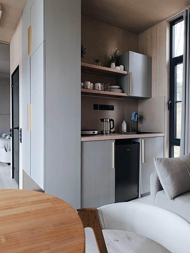 - мини-кухня с барной стойкой, индукционной плитой, холодильником, микроволновкой,