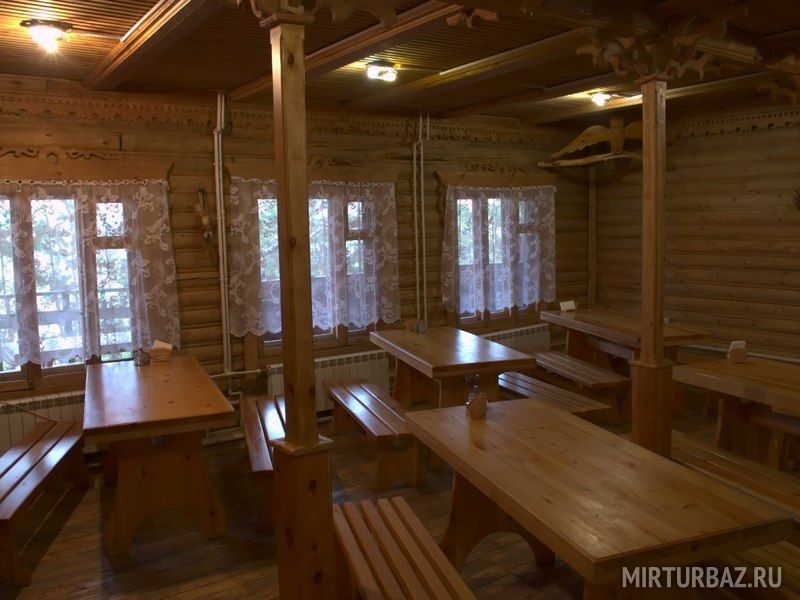 На территории располагается кафе на 25 посадочных мест. Акцент меню сделан на домашнюю и походную кухню.