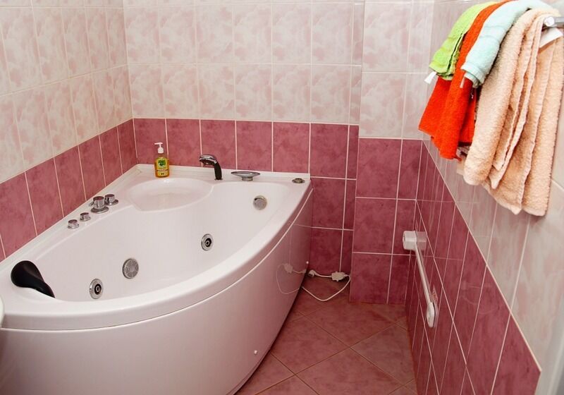 Джакузи, душевая кабина, санузел, холодильник, телевизор, DVD, Интернет, телефон.