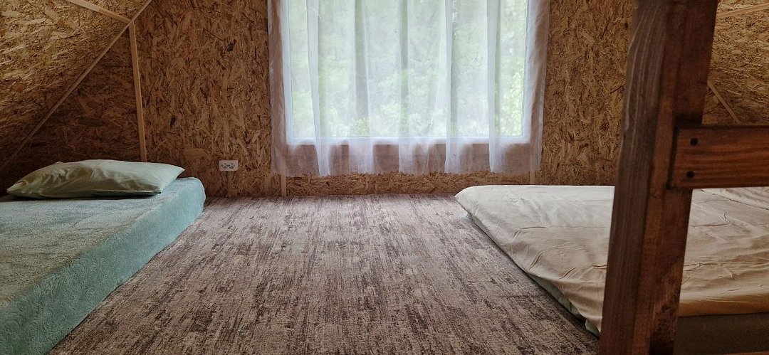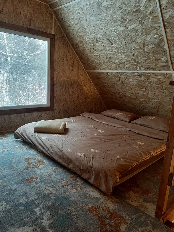 Отдельный мини-коттедж со спальным полуэтажом. На втором этаже панорамные окна на гору и лес. Санузел с душевой. Домик полностью укомплектован всем необходимым для комфортного проживания.