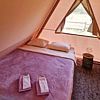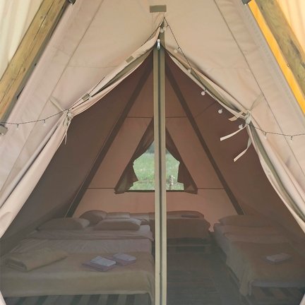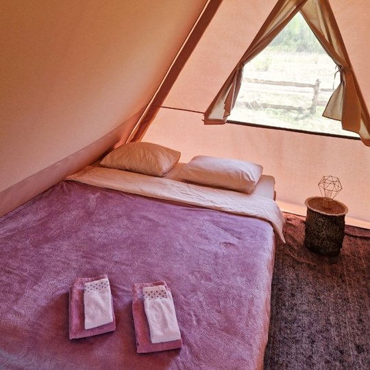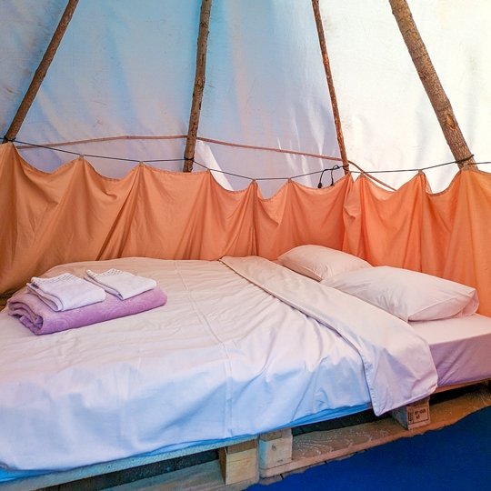 Экзотические палатки по типу индейского жилища на деревянном помосте, с двумя отдельными кроватями или с одной двуспальной кроватью. Теплые простыни на случай прохладной погоды. К каждой палатке подведено электричество. Ортопедические матрасы для комфортного сна. Территория обработана от клещей. Стандартно идет двухместное размещение. Для тех, кто хочет приехать с детьми, возможно поставить доп. место.