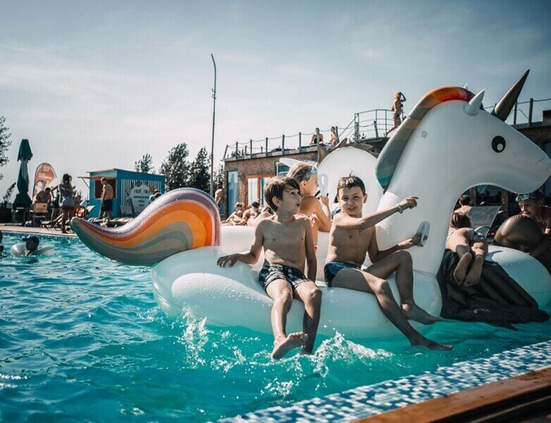 Летняя зона вмещает до 600 посетителей одновременно. Зона отдыха представляет собой закрытую территорию, включающую в себя бассейн 10х20 метров с подсветкой, детский бассейн, площадку для загара, летнее кафе на 150 мест, пляж. Зона отдыха открыта для всех желающих!