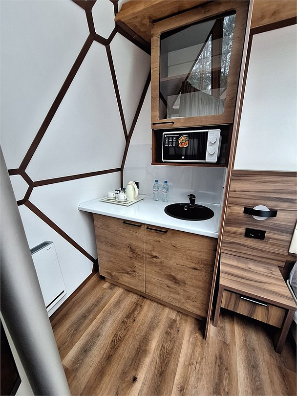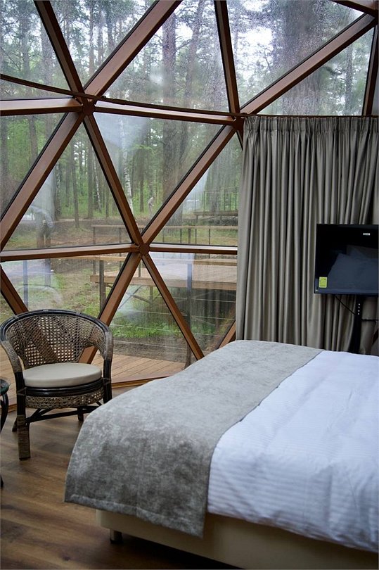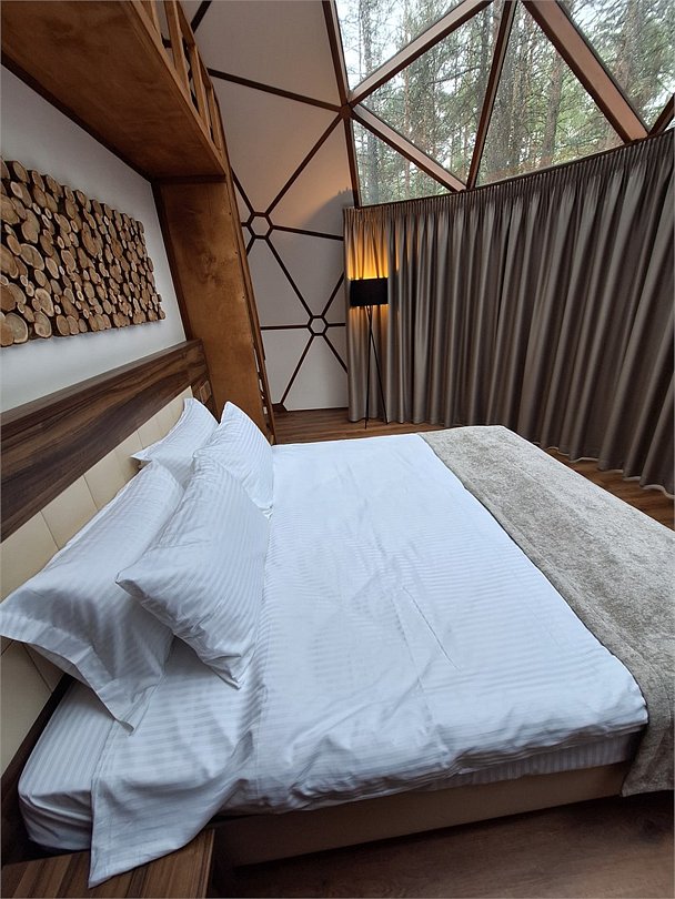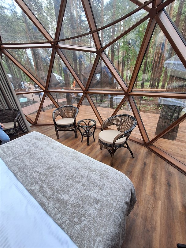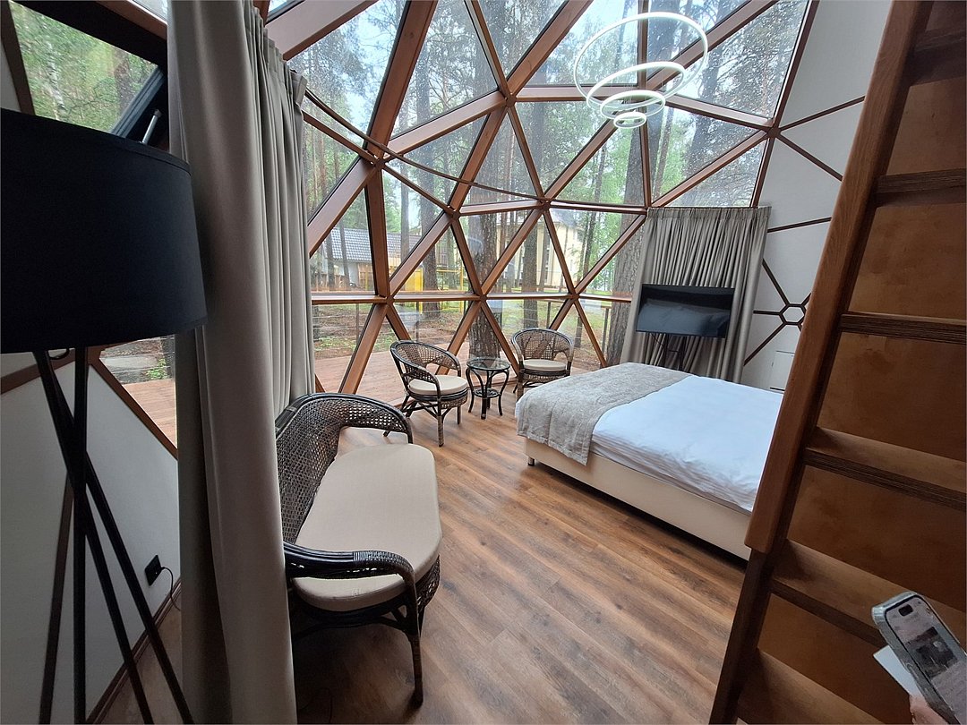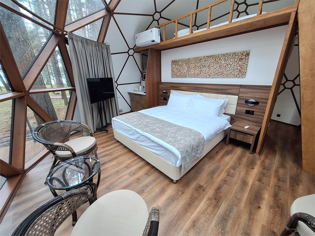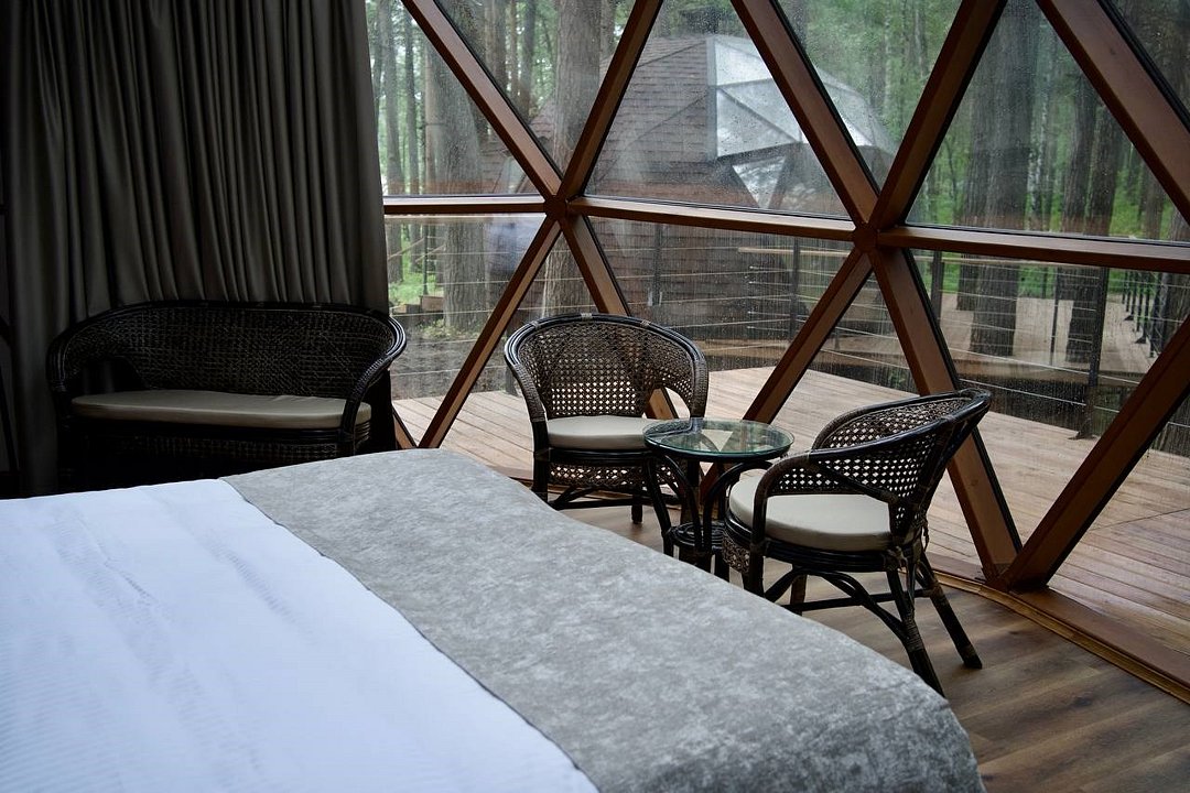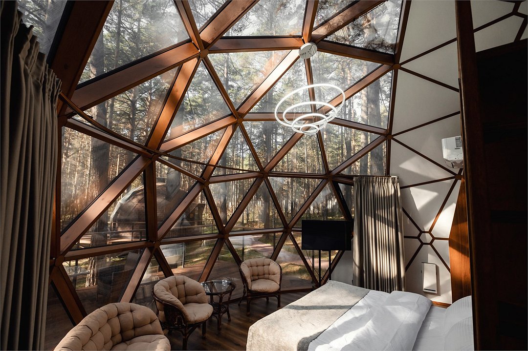 Wi-Fi, холодильник, кондиционер, светильник, фен, электронные замки, микроволновая печь, душевая кабина, санузел, теплый пол, халаты, банные полотенца, пляжные полотенца, тапочки, косметические средства, две двуспальные кровати, кресла, шкаф для одежды, журнальный столик, набор посуды, сейф, раковина, ламинат, кухонная посуда, стаканы, туалетные средства, панорамные окна, телевизор с плоским экраном, мини-холодильник, мини-кухня, кухонный уголок, теплые полы, usb порт, вид на лес, система умный дом, чайная станция, набор для приготовления чая и кофе, бутилированная вода, шапочка для душа, мыло, затемняющая штора, окна от пола до потолка, можно с питомцамиВ домике