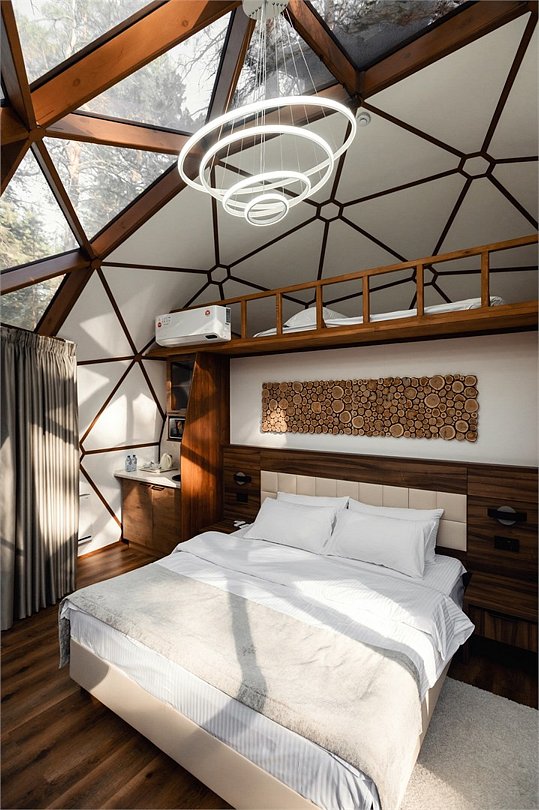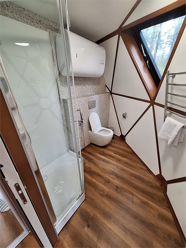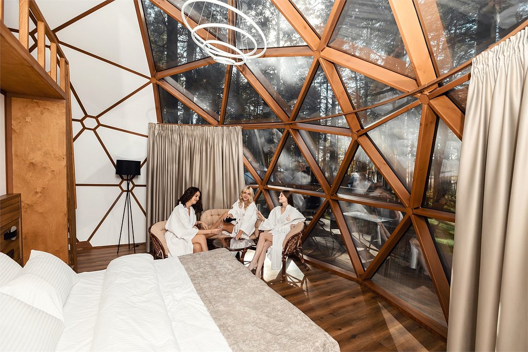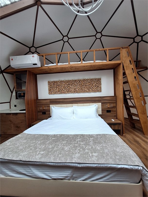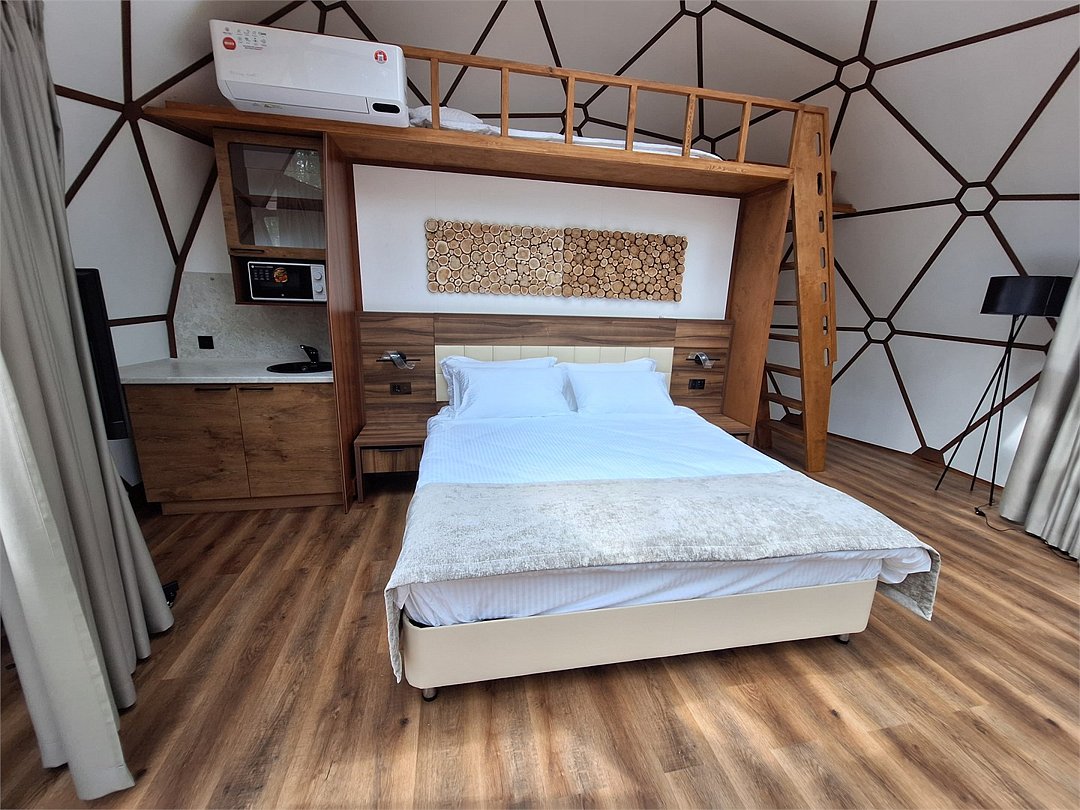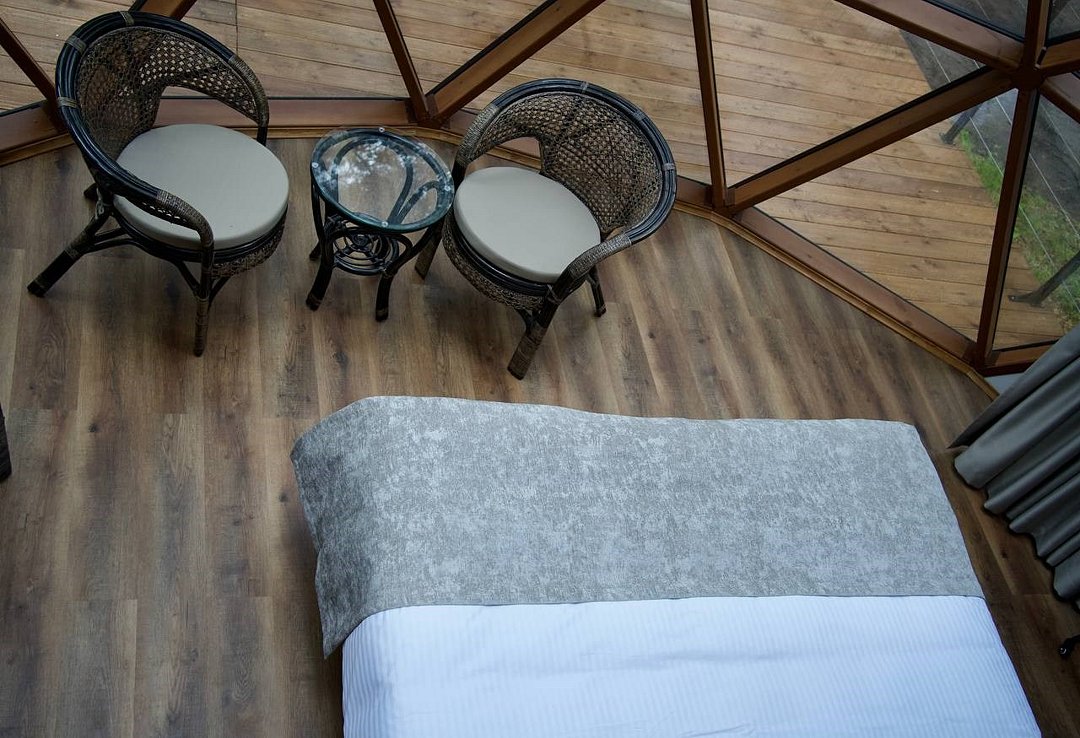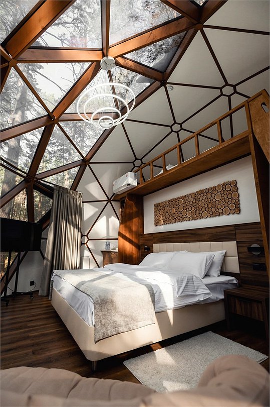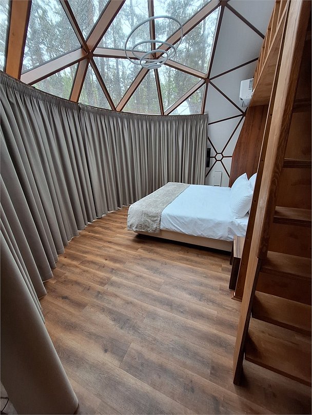 Wi-Fi, холодильник, кондиционер, светильник, фен, электронные замки, микроволновая печь, душевая кабина, санузел, теплый пол, халаты, банные полотенца, пляжные полотенца, тапочки, косметические средства, две двуспальные кровати, кресла, шкаф для одежды, журнальный столик, набор посуды, сейф, раковина, ламинат, кухонная посуда, стаканы, туалетные средства, панорамные окна, телевизор с плоским экраном, мини-холодильник, мини-кухня, кухонный уголок, теплые полы, usb порт, вид на лес, система умный дом, чайная станция, набор для приготовления чая и кофе, бутилированная вода, шапочка для душа, мыло, затемняющая штора, окна от пола до потолка, можно с питомцамиВ домике