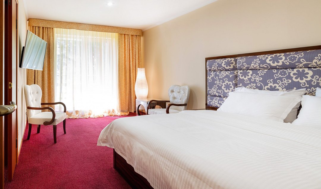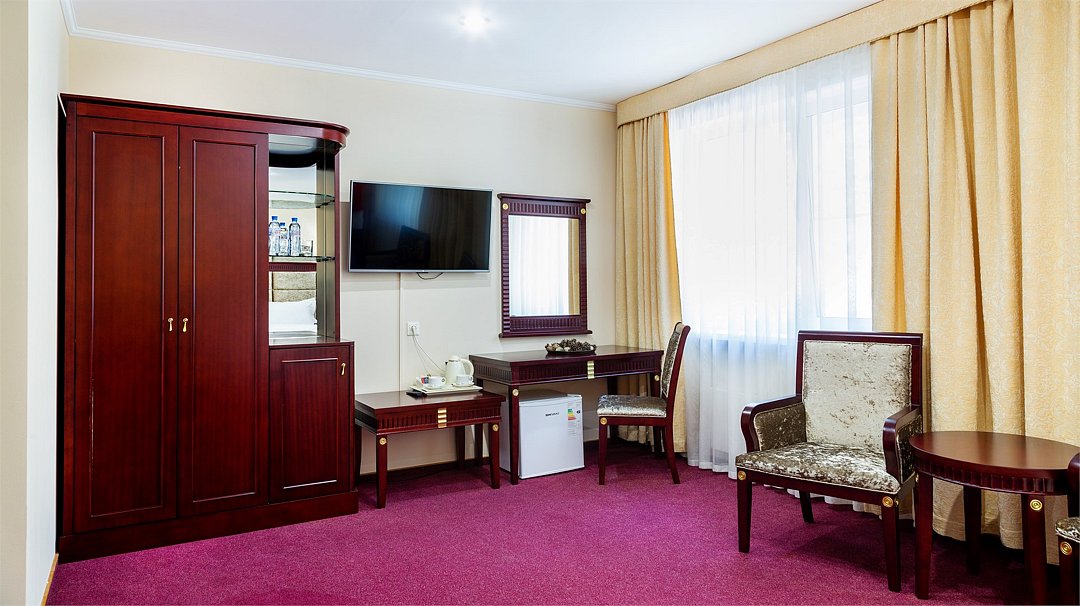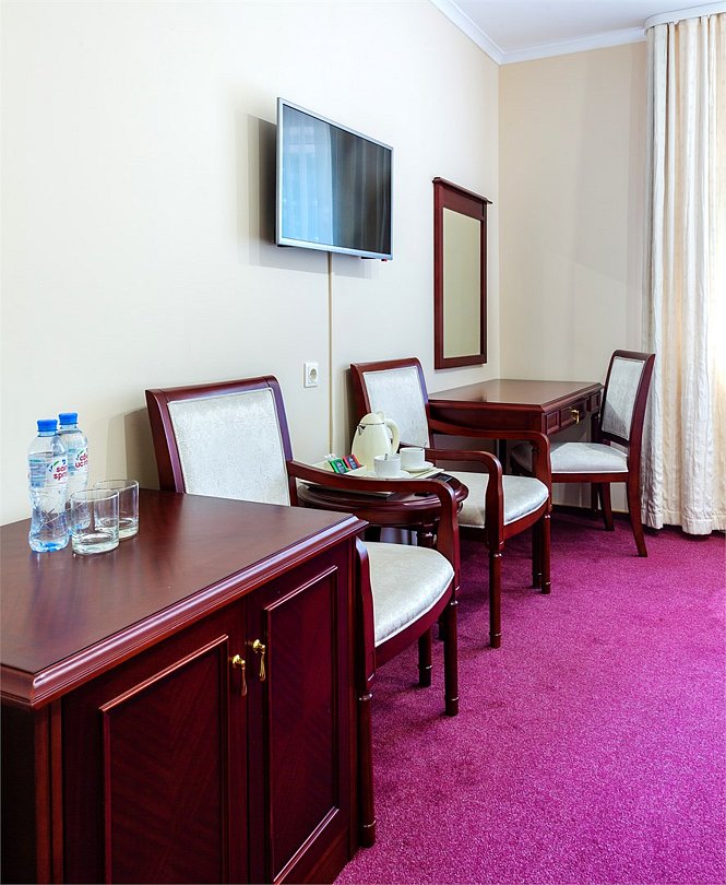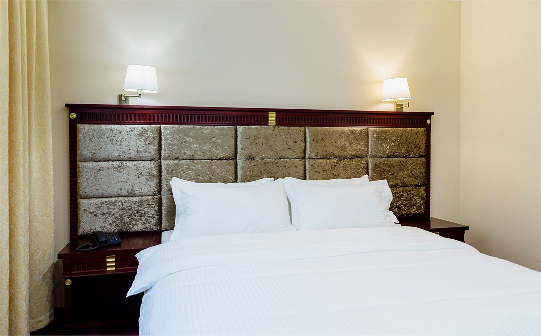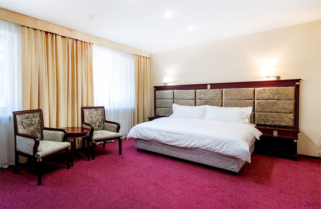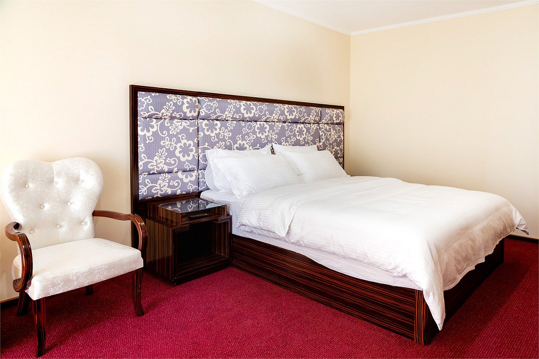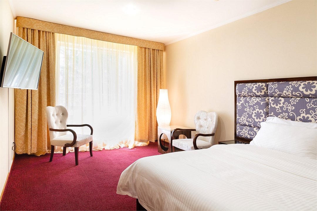 Однокомнатные номера в классическом стиле с одной большой двуспальной кроватью размера king-size. При выборе номера данной категории вы получаете по максимально выгодной цене комфортный и шикарный номер категории "Полулюкс". Отлично подходят для размещения семейным парам с детьми. Характеристики: Площадь номера – 39 кв. м. (комната: 27 кв. м., прихожая: 5 кв. м., гардеробная: 2 кв. м., туалетная комната: 5 кв. м.). Описание В номере: двуспальная кровать с ортопедическим матрасом, прикроватные тумбочки, мягкая мебель, рабочая зона, журнальный столик, телевизор, мини-бар (платно), кофейный стол, чайная станция, набор посуды, багажная тумба, сейф. В туалетной комнате –душевая кабина, фен, набор туалетных принадлежностей, мягкие полотенца, халат, тапочки.Услуги и удобства