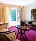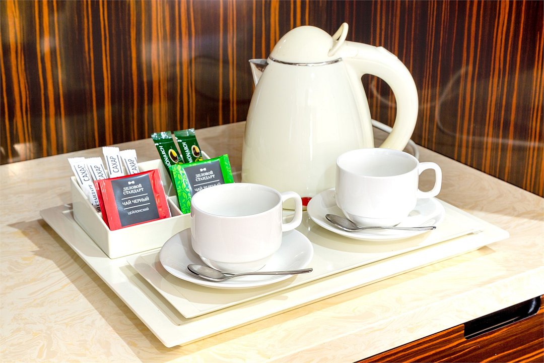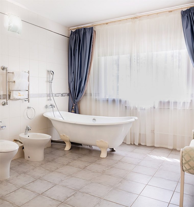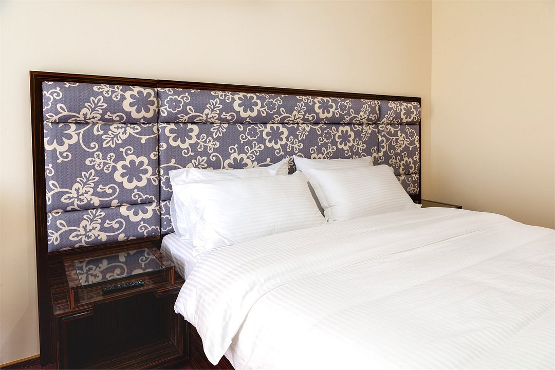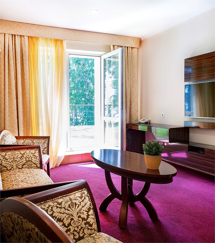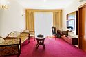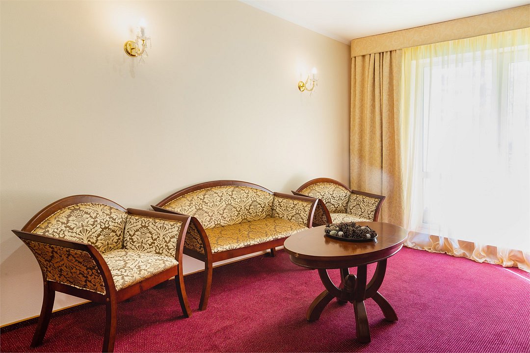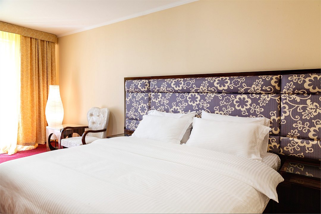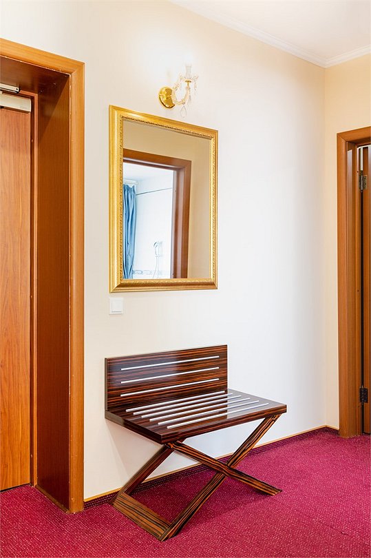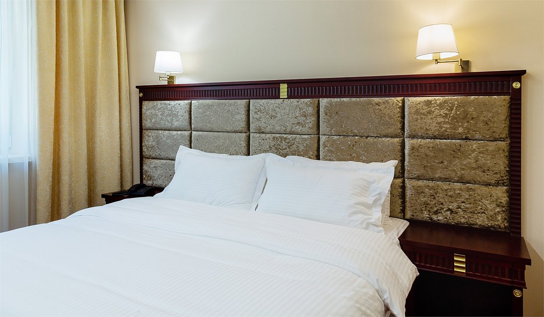 Однокомнатные номера в классическом стиле с одной большой двуспальной кроватью размера king-size. При выборе номера данной категории вы получаете по максимально выгодной цене комфортный и шикарный номер категории "Полулюкс". Отлично подходят для размещения семейным парам с детьми. Характеристики: Площадь номера – 39 кв. м. (комната: 27 кв. м., прихожая: 5 кв. м., гардеробная: 2 кв. м., туалетная комната: 5 кв. м.). Описание В номере: двуспальная кровать с ортопедическим матрасом, прикроватные тумбочки, мягкая мебель, рабочая зона, журнальный столик, телевизор, мини-бар (платно), кофейный стол, чайная станция, набор посуды, багажная тумба, сейф. В туалетной комнате –душевая кабина, фен, набор туалетных принадлежностей, мягкие полотенца, халат, тапочки.Услуги и удобства