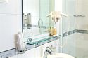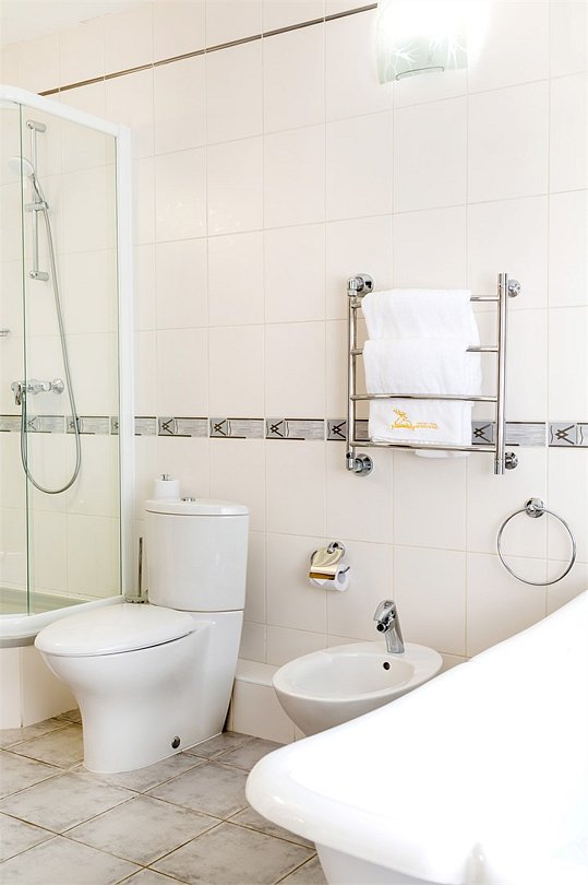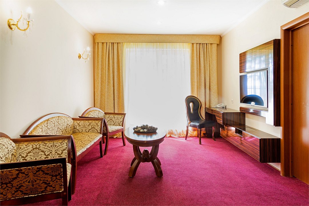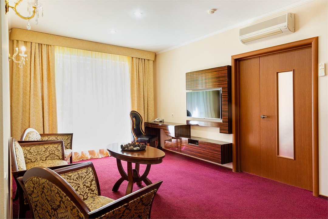 В номере 2 комнаты + гардеробная комната. Все номера «люкс» имеют балкон и оснащены кондиционером. В комнатах 2 Ж/К телевизора, холодильник. Туалетная комната с чугунной ванной (пр-ва Франции) и душевой кабиной, биде и феном. Размер номера: 54,2 кв.м. (гостиная: 19,9 кв.м., спальня: 18,3 кв.м., гардеробная: 3,14 кв.м., туалетная комната: 12,95 кв.м.)