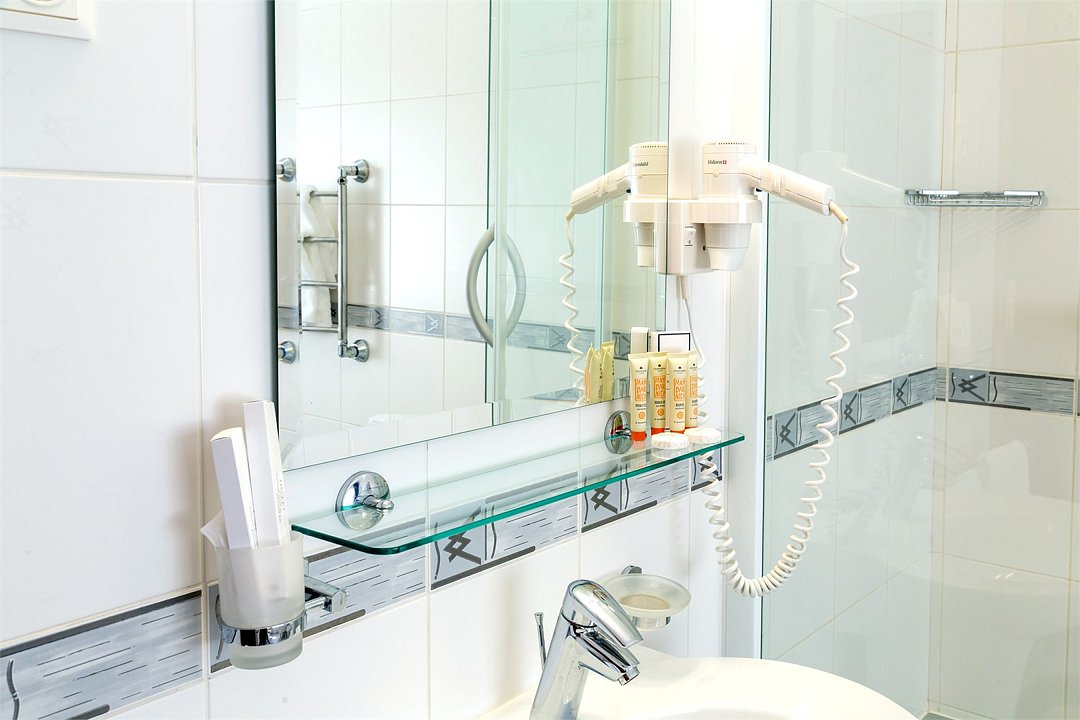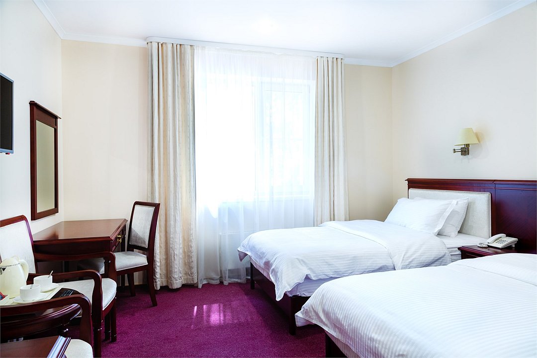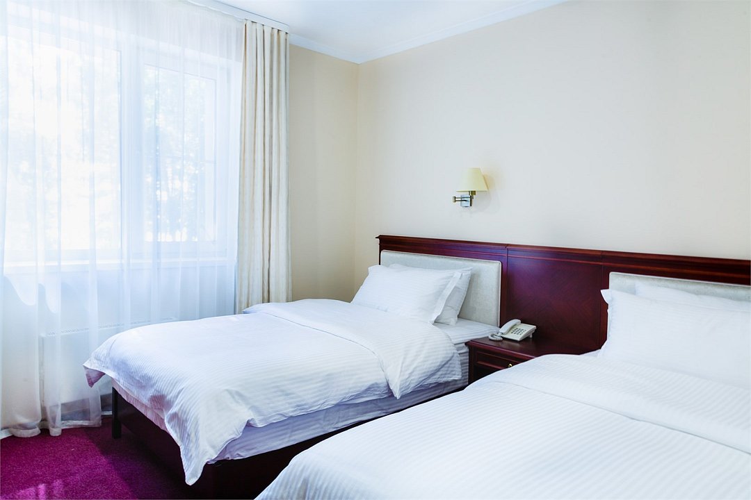 НОМЕР СТАНДАРТ С ДВУМЯ ОТДЕЛЬНЫМИ КРОВАТЯМИ Уютный однокомнатный номер по доступной стоимости с двумя отдельными кроватями станет отличным местом для отдыха. В комнате есть все необходимое для комфортного отдыха. Такой вариант прекрасно подходит для любых поездок. Характеристики Площадь номера: 22 кв. м. (комната: 15 кв. м., прихожая: 3 кв. м., туалетная комната: 4 кв. м.). Описание В номере: две отдельные полутораспальные кровати, прикроватные тумбочки, кресло, телевизор, стул, чайная станция, гардеробный шкаф, сейф. В туалетной комнате –душевая кабина, фен, набор туалетных принадлежностей, мягкие полотенца, халат, тапочки.Услуги и удобства